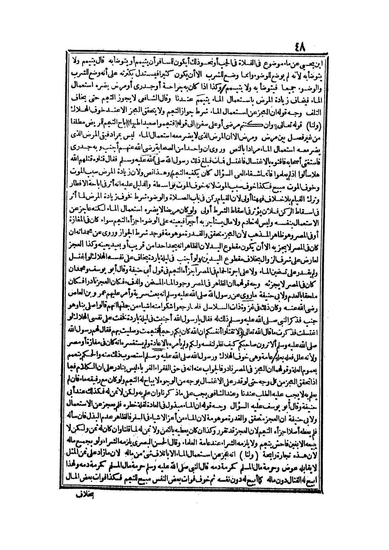 نَصْرُ بْنُ يَحْيَى عَنْ مَاءٍ مَوْضُوعٍ فِي الْفَلَاةِ فِي الْجُبِّ، أَوْ نَحْوِ ذَلِكَ أَيَكُونُ لِلْمُسَافِرِ أَنْ يَتَيَمَّمَ أَوْ يَتَوَضَّأَ بِهِ؟ قَالَ: يَتَيَمَّمُ وَلَا يَتَوَضَّأُ بِهِ؛ لِأَنَّهُ لَمْ يُوضَعْ لِلْوُضُوءِ، وَإِنَّمَا وُضِعَ لِلشُّرْبِ؛ إلَّا أَنْ يَكُونَ كَثِيرًا فَيُسْتَدَلُّ بِكَثْرَتِهِ عَلَى أَنَّهُ وُضِعَ لِلشُّرْبِ، وَالْوُضُوءِ جَمِيعًا فَيَتَوَضَّأُ بِهِ وَلَا يَتَيَمَّمُ، وَكَذَا إذَا كَانَ بِهِ جِرَاحَةٌ، أَوْ جُدَرِيٌّ أَوْ مَرَضٌ يَضُرُّهُ اسْتِعْمَالُ الْمَاءِ فَيَخَافُ زِيَادَةَ الْمَرَضِ بِاسْتِعْمَالِ الْمَاءِ يَتَيَمَّمُ عِنْدَنَا وَقَالَ الشَّافِعِيُّ: لَا يَجُوزُ التَّيَمُّمُ، حَتَّى يَخَافَ التَّلَفَ وَجْهُ قَوْلِهِ أَنَّ الْعَجْزَ عَنْ اسْتِعْمَالِ الْمَاءِ شَرْطُ جَوَازِ التَّيَمُّمِ وَلَا يَتَحَقَّقُ الْعَجْزُ إلَّا عِنْدَ خَوْفِ الْهَلَاكِ.
