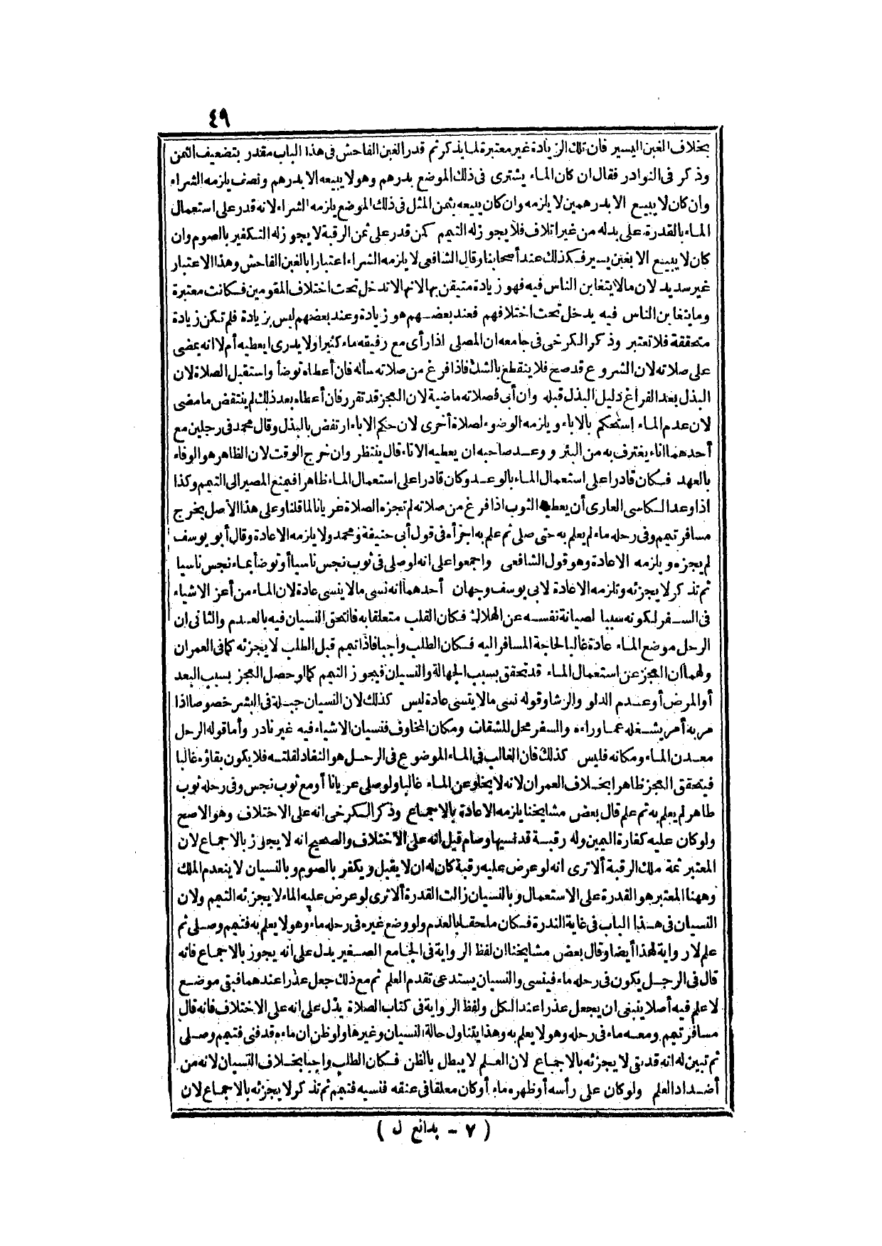 وَذَكَرَ الْكَرْخِيُّ فِي جَامِعِهِ أَنَّ الْمُصَلِّيَ إذَا رَأَى مَعَ رَفِيقِهِ مَاءً كَثِيرًا وَلَا يَدْرِي أَيُعْطِيهِ أَمْ لَا؟ أَنَّهُ يَمْضِي عَلَى صَلَاتِهِ؛ لِأَنَّ الشُّرُوعَ قَدْ صَحَّ، فَلَا يَنْقَطِعُ بِالشَّكِّ فَإِذَا فَرَغَ مِنْ صَلَاتِهِ سَأَلَهُ، فَإِنْ أَعْطَاهُ تَوَضَّأَ، وَاسْتَقْبَلَ الصَّلَاةَ، لِأَنَّ الْبَذْلَ بَعْدَ الْفَرَاغِ دَلِيلُ الْبَذْلِ قَبْلَهُ، وَإِنْ أَبَى فَصَلَاتُهُ مَاضِيَةٌ؛ لِأَنَّ الْعَجْزَ قَدْ تَقَرَّرَ، فَإِنْ أَعْطَاهُ بَعْدَ ذَلِكَ لَمْ يُنْتَقَضْ مَا مَضَى؛ لِأَنَّ عَدَمَ الْمَاءِ اسْتَحْكَمَ بِالْإِبَاءِ، وَيَلْزَمُهُ الْوُضُوءُ لِصَلَاةٍ أُخْرَى؛ لِأَنَّ حُكْمَ الْإِبَاءِ ارْتَفَضَ بِالْبَذْلِ وَقَالَ مُحَمَّدٌ فِي رَجُلَيْنِ مَعَ أَحَدِهِمَا إنَاءٌ يَغْتَرِفُ بِهِ مِنْ الْبِئْرِ وَوَعَدَ صَاحِبَهُ أَنْ يُعْطِيَهُ الْإِنَاءَ قَالَ: يَنْتَظِرُ، وَإِنْ خَرَجَ الْوَقْتُ؛ لِأَنَّ الظَّاهِرَ هُوَ الْوَفَاءُ بِالْعَهْدِ فَكَانَ قَادِرًا عَلَى اسْتِعْمَالِ الْمَاءِ بِالْوَعْدِ، وَكَانَ قَادِرًا عَلَى اسْتِعْمَالِ الْمَاءِ ظَاهِرًا، فَيُمْنَعُ الْمَصِيرُ إلَى التَّيَمُّمِ، وَكَذَا إذَا وَعَدَ الْكَاسِي الْعَارِيَ أَنْ يُعْطِيَهُ الثَّوْبَ إذَا فَرَغَ مِنْ صَلَاتِهِ لَمْ تُجْزِهِ الصَّلَاةُ عُرْيَانًا لِمَا قُلْنَا، وَعَلَى هَذَا الْأَصْلِ يُخَرَّجُ مُسَافِرٌ تَيَمَّمَ، وَفِي رَحْلِهِ مَاءٌ لَمْ يَعْلَمْ بِهِ، حَتَّى صَلَّى، ثُمَّ عَلِمَ بِهِ أَجْزَأَهُ فِي قَوْلِ أَبِي حَنِيفَةَ، وَمُحَمَّدٍ وَلَا يَلْزَمُهُ الْإِعَادَةُ.