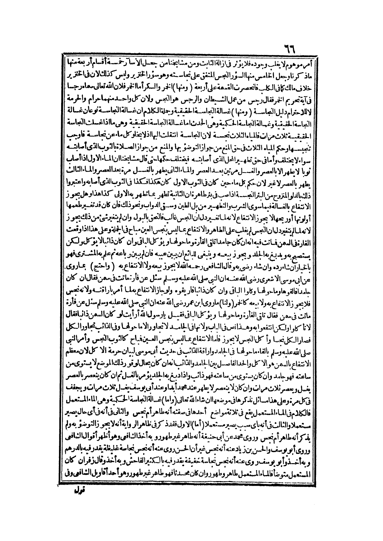 (وَأَمَّا) غُسَالَةُ النَّجَاسَةِ الْحُكْمِيَّةِ وَهِيَ الْمَاءُ الْمُسْتَعْمَلُ فَالْكَلَامُ فِي الْمَاءِ الْمُسْتَعْمَلِ يَقَعُ فِي ثَلَاثَةِ مَوَاضِعَ: أَحَدُهَا - فِي صِفَتِهِ أَنَّهُ طَاهِرٌ أَمْ نَجِسٌ؟ وَالثَّانِي - فِي أَنَّهُ فِي أَيِّ حَالٍ يَصِيرُ مُسْتَعْمَلًا؟ وَالثَّالِثُ - فِي أَنَّهُ بِأَيِّ سَبَبٍ يَصِيرُ مُسْتَعْمَلًا؟ (أَمَّا) الْأَوَّلُ فَقَدْ ذَكَرَ فِي ظَاهِر الرِّوَايَةِ أَنَّهُ لَا يَجُوزُ التَّوَضُّؤُ بِهِ وَلَمْ يَذْكُرْ أَنَّهُ طَاهِرٌ أَمْ نَجِسٌ؟ وَرَوَى مُحَمَّدٌ عَنْ أَبِي حَنِيفَةَ أَنَّهُ طَاهِرٌ غَيْرُ طَهُورٍ وَبِهِ أَخَذَ الشَّافِعِيُّ، وَهُوَ أَظْهَرُ أَقْوَالِ الشَّافِعِيِّ، وَرَوَى أَبُو يُوسُفَ وَالْحَسَنُ بْنُ زِيَادٍ عَنْهُ أَنَّهُ نَجِسٌ، غَيْرَ أَنَّ الْحَسَنَ رَوَى عَنْهُ أَنَّهُ نَجِسٌ نَجَاسَةً غَلِيظَةً يُقَدَّرُ فِيهِ بِالدِّرْهَمِ وَبِهِ أَخَذَ وَأَبُو يُوسُفَ رُوِيَ عَنْهُ أَنَّهُ نَجِسٌ نَجَاسَةً خَفِيفَةً يُقَدَّرُ فِيهِ بِالْكَثِيرِ الْفَاحِشِ وَبِهِ أَخَذَ وَقَالَ زُفَرُ: إنْ كَانَ الْمُسْتَعْمِلُ مُتَوَضِّئًا فَالْمَاءُ الْمُسْتَعْمَلُ طَاهِرٌ وَطَهُورٌ، وَإِنْ كَانَ مُحْدِثًا فَهُوَ طَاهِرٌ غَيْرُ طَهُورٍ وَهُوَ أَحَدُ أَقَاوِيلِ الشَّافِعِيِّ، وَفِي