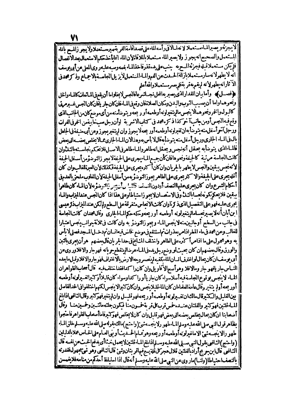 وَقَالَ عَامَّةُ الْعُلَمَاءِ: إنْ كَانَ الْمَاءُ قَلِيلًا يَنْجَسُ، وَإِنْ كَانَ كَثِيرًا لَا يَنْجَسُ، لَكِنَّهُمْ اخْتَلَفُوا فِي الْحَدِّ الْفَاصِلِ بَيْنَ الْقَلِيلِ وَالْكَثِيرِ قَالَ مَالِكٌ: إنْ تَغَيَّرَ لَوْنُهُ أَوْ طَعْمُهُ أَوْ رِيحُهُ فَهُوَ قَلِيلٌ، وَإِنْ لَمْ يَتَغَيَّرْ فَهُوَ كَثِيرٌ وَقَالَ الشَّافِعِيُّ: إذَا بَلَغَ الْمَاءُ قُلَّتَيْنِ فَهُوَ كَثِيرٌ، وَالْقُلَّتَانِ عِنْدَهُ خَمْسُ قِرَبٍ، كُلُّ قِرْبَةٍ خَمْسُونَ مَنًّا فَيَكُونُ جُمْلَتُهُ مِائَتَيْنِ وَخَمْسِينَ مَنًّا وَقَالَ أَصْحَابُنَا: إنْ كَانَ بِحَالٍ يَخْلُصُ بَعْضُهُ إلَى بَعْضٍ فَهُوَ قَلِيلٌ، وَإِنْ كَانَ لَا يَخْلُصُ فَهُوَ كَثِيرٌ.