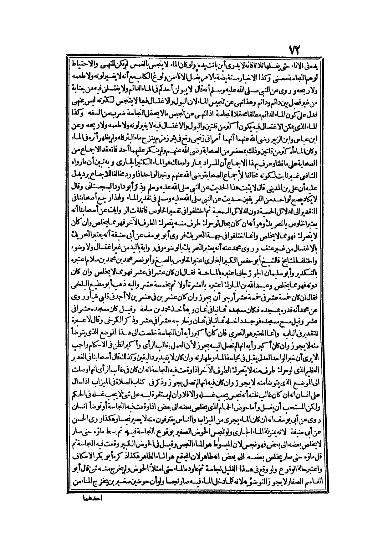 وَرُوِيَ عَنْ النَّبِيِّ - صَلَّى اللَّهُ عَلَيْهِ وَسَلَّمَ - أَنَّهُ قَالَ: «لَا يَبُولَنَّ أَحَدُكُمْ فِي الْمَاءِ الدَّائِمِ وَلَا يَغْتَسِلَنَّ فِيهِ مِنْ جَنَابَةٍ» مِنْ غَيْرِ فَصْلٍ بَيْنَ دَائِمٍ وَدَائِمٍ وَهَذَا نَهْيٌ عَنْ تَنْجِيسِ الْمَاءِ؛ لِأَنَّ الْبَوْلَ وَالِاغْتِسَالَ فِيمَا لَا يَتَنَجَّسُ لِكَثْرَتِهِ لَيْسَ بِمَنْهِيٍّ، فَدَلَّ عَلَى كَوْنِ الْمَاءِ الدَّائِمِ مُطْلَقًا مُحْتَمِلًا لِلنَّجَاسَةِ، إذْ النَّهْيُ عَنْ تَنْجِيسِ مَا لَا يَحْتَمِلُ النَّجَاسَةَ ضَرْبٌ مِنْ السَّفَهِ، وَكَذَا الْمَاءُ الَّذِي يُمْكِنُ الِاغْتِسَالُ فِيهِ يَكُونُ أَكْثَرَ مِنْ قُلَّتَيْنِ، وَالْبَوْلُ وَالِاغْتِسَالُ فِيهِ لَا يُغَيِّرُ لَوْنَهُ وَلَا طَعْمَهُ وَلَا رِيحَهُ.