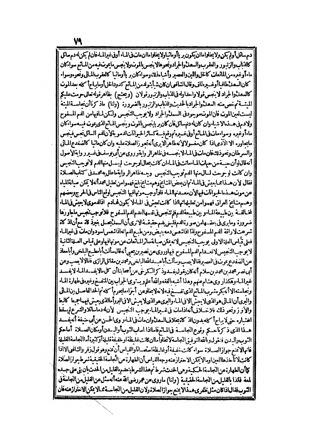 ، وَبَعْضُهُمْ - وَهُمْ مَشَايِخُ الْعِرَاقِ - فَهِمُوا مِنْ تَعْلِيلِهِ أَنَّهَا إذَا كَانَتْ تَعِيشُ فِي الْمَاءِ لَا يَكُونُ لَهَا دَمٌ، إذْ الدَّمَوِيُّ لَا يَعِيشُ فِي الْمَاءِ لِمُخَالَفَةٍ بَيْنَ طَبِيعَةِ الْمَاءِ وَبَيْنَ طَبِيعَةِ الدَّمِ، فَلَمْ تَتَنَجَّسْ فِي نَفْسِهَا؛ لِعَدَمِ الدَّمِ الْمَسْفُوحِ، فَلَا تُوجِبُ تَنْجِيسَ مَا جَاوَرَهَا ضَرُورَةً، وَمَا يُرَى فِي بَعْضِهَا مِنْ صُورَةِ الدَّمِ فَلَيْسَ بِدَمٍ حَقِيقَةً، أَلَا تَرَى أَنَّ السَّمَكَ يَحِلُّ بِغَيْرِ ذَكَاةٍ مَعَ أَنَّ الذَّكَاةَ شُرِعَتْ لِإِرَاقَةِ الدَّمِ الْمَسْفُوحِ وَلِذَا، إذَا شَمَسَ دَمُهُ يَبْيَضُّ، وَمِنْ طَبْعِ الدَّمِ أَنَّهُ إذَا شَمَسَ اسْوَدَّ، وَإِنْ مَاتَ فِي غَيْرِ الْمَاءِ فَعَلَى قِيَاسِ الْعِلَّةِ الْأُولَى يُوجِبُ التَّنْجِيسَ؛ لِأَنَّهُ يُمْكِنُ صِيَانَةُ سَائِرِ الْمَائِعَاتِ عَنْ مَوْتِهَا فِيهَا، وَعَلَى قِيَاسِ الْعِلَّةِ الثَّانِيَةِ لَا يُوجِبُ التَّنْجِيسَ لِانْعِدَامِ الدَّمِ الْمَسْفُوحِ فِيهَا.