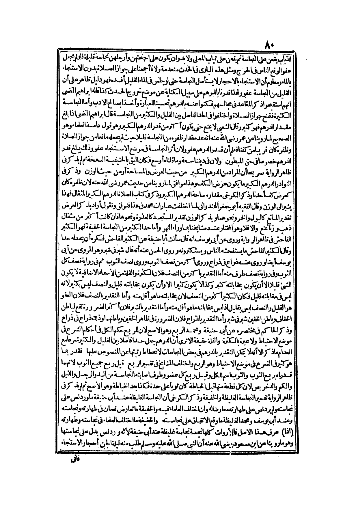 وَقَالَ الْفَقِيهُ أَبُو جَعْفَر الْهِنْدُوَانِيُّ: لَمَّا اخْتَلَفَتْ عِبَارَاتُ مُحَمَّدٍ فِي هَذَا فَنُوَفِّقُ وَنَقُولُ: أَرَادَ بِذِكْرِ الْعَرْضِ تَقْدِيرَ الْمَائِعِ، كَالْبَوْلِ وَالْخَمْرِ وَنَحْوِهِمَا، وَبِذِكْرِ الْوَزْنِ تَقْدِيرُ الْمُسْتَجْسِدِ كَالْعَذِرَةِ وَنَحْوِهَا، فَإِنْ كَانَتْ أَكْثَرَ مِنْ مِثْقَالِ ذَهَبٍ وَزْنًا تُمْنَعُ؛ وَإِلَّا فَلَا، وَهُوَ الْمُخْتَارُ عِنْدَ مَشَايِخِنَا بِمَا وَرَاءَ النَّهْرِ وَأَمَّا حَدُّ الْكَثِيرِ مِنْ النَّجَاسَةِ الْخَفِيفَةِ فَهُوَ الْكَثِيرُ الْفَاحِشُ فِي ظَاهِرِ الرِّوَايَةِ.