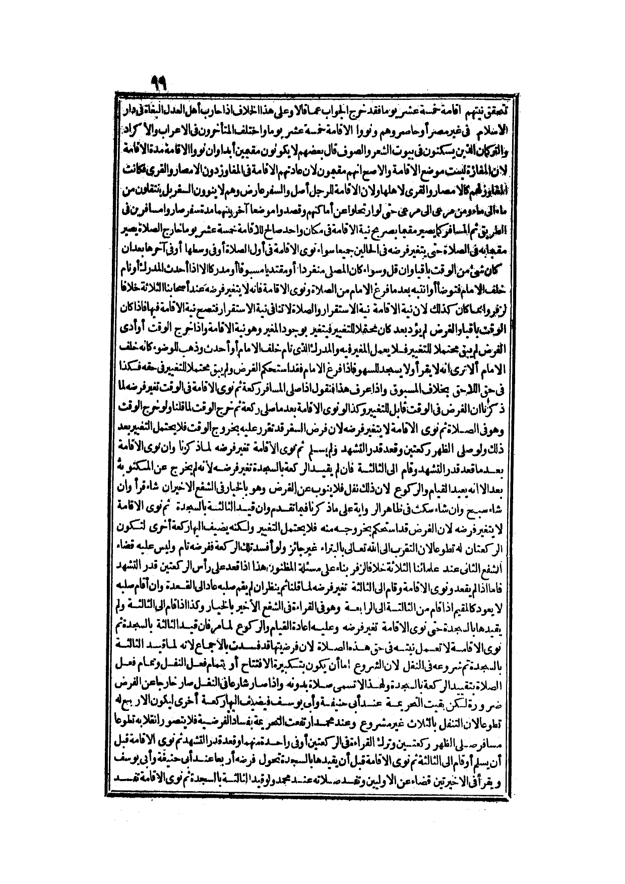 وَكَذَا إذَا قَامَ إلَى الثَّالِثَةِ وَلَمْ يُقَيِّدْهَا بِالسَّجْدَةِ حَتَّى نَوَى الْإِقَامَةَ تَغَيَّرَ فَرْضُهُ وَعَلَيْهِ إعَادَةُ الْقِيَامِ وَالرُّكُوعِ لِمَا مَرَّ، فَإِنْ قَيَّدَ الثَّالِثَةَ بِالسَّجْدَةِ ثُمَّ نَوَى الْإِقَامَةَ لَا تَعْمَلُ نِيَّتُهُ فِي حَقِّ هَذِهِ الصَّلَاةِ؛ لِأَنَّ فَرْضِيَّتَهَا قَدْ فَسَدَتْ بِالْإِجْمَاعِ؛ لِأَنَّهُ لَمَّا قَيَّدَ الثَّالِثَةَ بِالسَّجْدَةِ تَمَّ شُرُوعُهُ فِي النَّفْلِ؛ لِأَنَّ الشُّرُوعَ إمَّا أَنْ يَكُونَ بِتَكْبِيرَةِ الِافْتِتَاحِ أَوْ بِتَمَامِ فِعْلِ النَّفْلِ، وَتَمَامُ فِعْلِ الصَّلَاةِ بِتَقْيِيدِ الرَّكْعَةِ بِالسَّجْدَةِ، وَلِهَذَا لَا تُسَمَّى صَلَاةً بِدُونِهِ، وَإِذَا صَارَ شَارِعًا فِي النَّفْلِ صَارَ خَارِجًا عَنْ الْفَرْضِ ضَرُورَةً لَكِنْ بَقِيَتْ التَّحْرِيمَةُ عِنْدَ أَبِي حَنِيفَةَ وَأَبِي يُوسُفَ فَيُضِيفُ إلَيْهَا رَكْعَةً أُخْرَى لِيَكُونَ الْأَرْجَحُ لَهُ تَطَوُّعًا؛ لِأَنَّ التَّنَفُّلَ بِالثَّلَاثِ غَيْرُ مَشْرُوعٍ وَعِنْدَ مُحَمَّدٍ ارْتَفَعَتْ التَّحْرِيمَةُ بِفَسَادِ الْفَرْضِيَّةِ فَلَا يُتَصَوَّرُ انْقِلَابُهُ تَطَوُّعًا مُسَافِرٌ صَلَّى الظُّهْرَ رَكْعَتَيْنِ وَتَرَكَ الْقِرَاءَةَ فِي الرَّكْعَتَيْنِ أَوْ فِي وَاحِدَةٍ مِنْهُمَا وَقَعَدَ قَدْرَ التَّشَهُّدِ ثُمَّ نَوَى الْإِقَامَةَ قَبْلَ أَنْ يُسَلِّمَ أَوْ قَامَ إلَى الثَّالِثَةِ ثُمَّ نَوَى الْإِقَامَةَ قَبْلَ أَنْ يُقَيِّدَهَا بِالسَّجْدَةِ تَحَوَّلَ فَرْضُهُ أَرْبَعًا عِنْدَ أَبِي حَنِيفَةَ وَأَبِي يُوسُفَ وَيَقْرَأُ فِي الْأَخِيرَتَيْنِ قَضَاءً عَنْ الْأُولَيَيْنِ، وَتَفْسُدُ صَلَاتُهُ عِنْدَ مُحَمَّدٍ، وَلَوْ قَيَّدَ الثَّالِثَةَ بِالسَّجْدَةِ ثُمَّ نَوَى الْإِقَامَةَ تَفْسُدُ