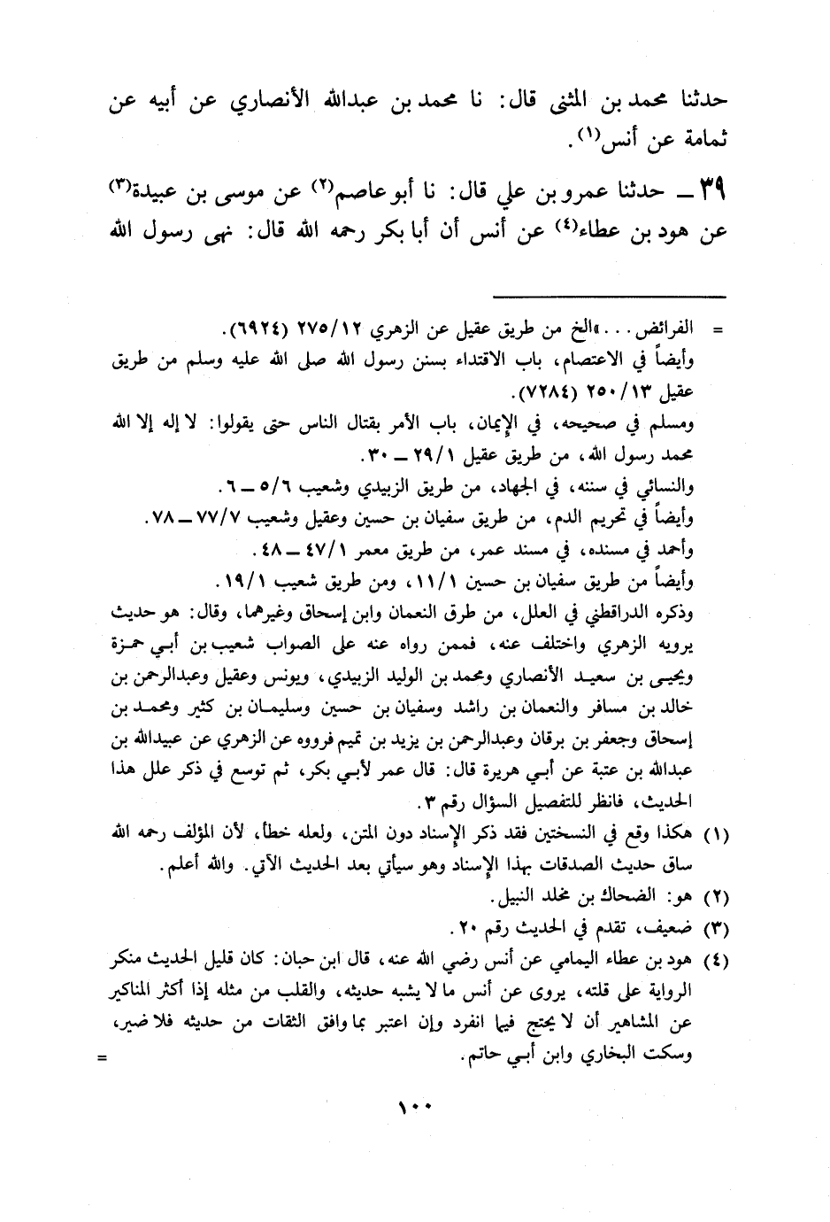 39 - حَدَّثَنَا عَمْرُو بْنُ عَلِيٍّ قَالَ: نا أَبُو عَاصِمٍ، عَنْ مُوسَى بْنِ عُبَيْدَةَ، عَنْ هُودِ بْنِ عَطَاءٍ، عَنْ أَنَسٍ، أَنَّ أَبَا بَكْرٍ رَحِمَهُ اللَّهُ قَالَ: «§نَهَى رَسُولُ اللَّهِ صَلَّى اللهُ عَلَيْهِ وَسَلَّمَ -[101]- عَنْ قَتْلِ الْمُصَلِّينَ» وَهُودُ بْنُ عَطَاءٍ لَا نَعْلَمُ حَدَّثَ عَنْهُ إِلَّا مُوسَى بْنُ عُبَيْدَةَ، وَقَدْ تَقَدَّمَ ذِكْرُنَا لِمُوسَى بْنِ عُبَيْدَةَ فِي تَشَاغُلِهِ بِالْعِبَادَةِ عَنْ تَحَفُّظِ الْحَدِيثِ
