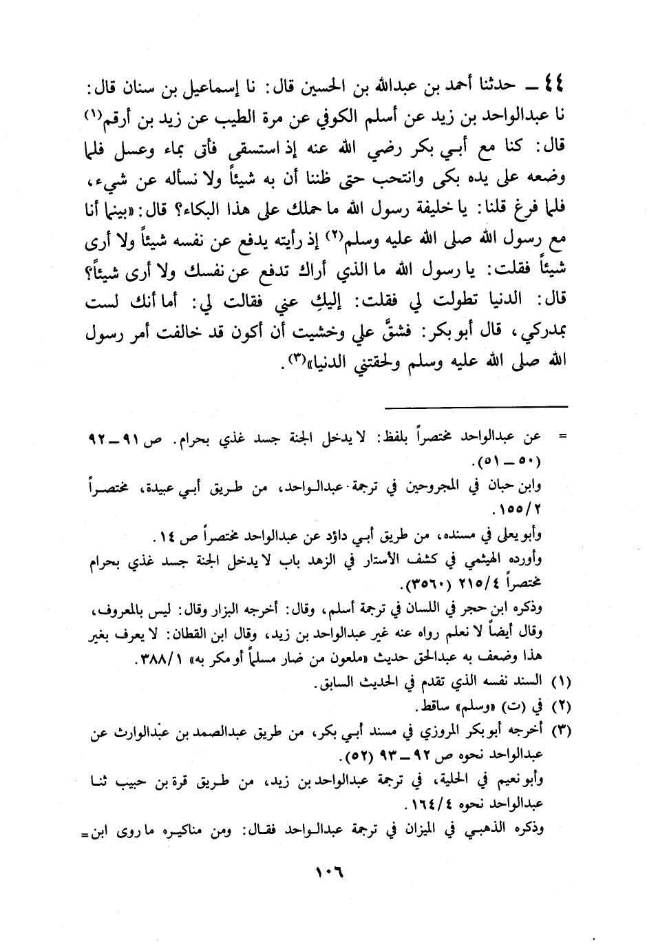 44 - حَدَّثَنَا أَحْمَدُ بْنُ عَبْدِ اللَّهِ بْنِ الْحُسَيْنِ قَالَ: نا إِسْمَاعِيلُ بْنُ سِنَانٍ قَالَ: نا عَبْدُ الْوَاحِدِ بْنُ زَيْدٍ، عَنْ أَسْلَمَ الْكُوفِيِّ، عَنْ مُرَّةَ الطَّيِّبِ، عَنْ زَيْدِ بْنِ أَرْقَمَ قَالَ: كُنَّا مَعَ أَبِي بَكْرٍ رَضِيَ اللَّهُ عَنْهُ إِذِ اسْتَسْقَى فَأَتَى بِمَاءٍ وَعَسَلٍ، فَلَمَّا وَضَعَهُ عَلَى يَدِهِ بَكَى وَانْتَحَبَ حَتَّى ظَنَنَّا أَنَّ بِهِ شَيْئًا وَلَا نَسْأَلُهُ عَنْ شَيْءٍ، فَلَمَّا فَرَغَ قُلْنَا: يَا خَلِيفَةَ رَسُولِ اللَّهِ مَا حَمَلَكَ عَلَى هَذَا الْبُكَاءِ؟ قَالَ: بَيْنَمَا أَنَا مَعُ رَسُولِ اللَّهِ صَلَّى اللهُ عَلَيْهِ وَسَلَّمَ إِذْ رَأَيْتُهُ يَدْفَعُ عَنْ نَفْسِهِ، شَيْئًا وَلَا أَرَى شَيْئًا فَقُلْتُ: يَا رَسُولَ اللَّهِ مَا الَّذِي أَرَاكَ تَدْفَعُ عَنْ نَفْسِكِ وَلَا أَرَى شَيْئًا قَالَ: " §الدُّنْيَا تَطَوَّلَتْ لِي فَقُلْتُ: إِلَيْكِ عَنِّي، فَقَالَتْ لِي: أَمَا إِنَّكَ لَسْتَ بِمُدْرِكِي "، قَالَ أَبُو بَكْرٍ: فَشَقَّ عَلَيَّ وَخَشِيتُ أَنْ أَكُونَ قَدْ خَالَفْتُ أَمْرَ رَسُولِ اللَّهِ صَلَّى اللهُ عَلَيْهِ وَسَلَّمَ وَلَحِقَتْنِي الدُّنْيَا -[107]-. وَعَبْدُ الْوَاحِدِ بْنُ زَيْدٍ رَجُلٌ مِنْ أَهْلِ الْبَصْرَةِ كَانَ مُتَعَبِّدًا وَأَحْسَبُهُ كَانَ يَذْهَبُ إِلَى الْقَدَرِ مَعَ شِدَّةِ عِبَادَتِهِ وَأَسْلَمُ الْكُوفِيُّ لَا نَعْلَمُ رَوَى عَنْهُ غَيْرُ عَبْدِ الْوَاحِدِ وَمُرَّةُ الطَّيِّبُ فَمُشْهُورٌ، رَوَى عَنْهُ غَيْرُ وَاحِدٍ، وَالْحَدِيثَانِ فَلَا نَعْلَمُ أَحَدًا رَوَاهُمَا عَنْ زَيْدِ بْنِ أَرْقَمَ، عَنْ أَبِي بَكْرٍ إِلَّا بِهَذَا الْإِسْنَادِ، وَحَدِيثُ «مَلْعُونٌ مَنْ ضَارَّ مُسْلِمًا أَوْ غَرَّهُ» فَقَدْ رَوَاهُ فَرْقَدٌ عَنْ مُرَّةَ، عَنْ أَبِي بَكْرٍ -[108]-، وَمُرَّةَ فَلَمْ يُدْرِكْ أَبَا بَكْرٍ