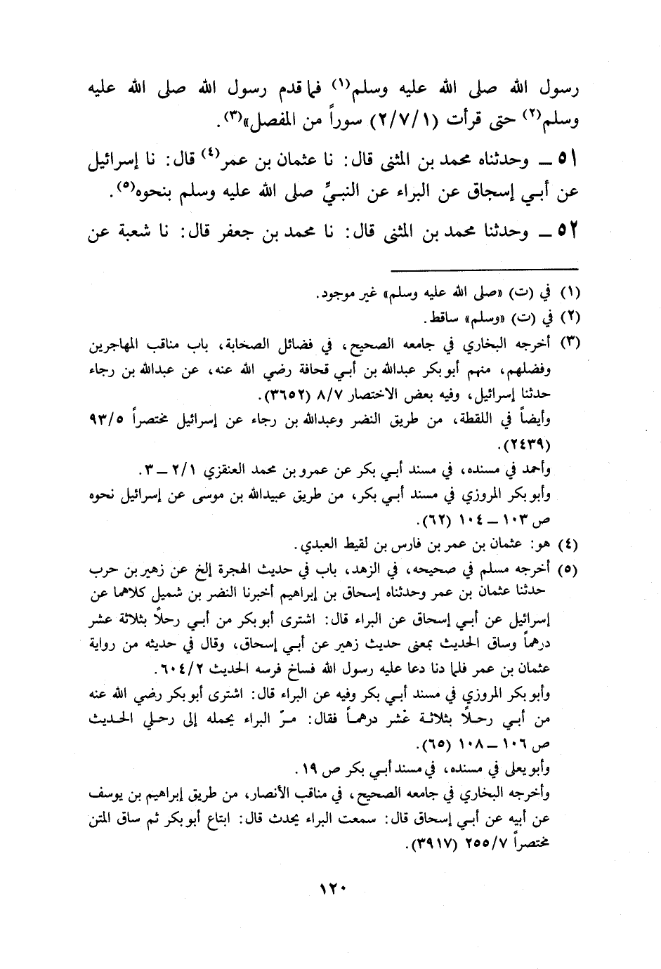52 - وَحَدَّثَنَا مُحَمَّدُ بْنُ الْمُثَنَّى قَالَ: نا مُحَمَّدُ بْنُ جَعْفَرٍ قَالَ: نا شُعْبَةُ، عَنْ -[121]- أَبِي إِسْحَاقَ، عَنِ الْبَرَاءِ قَالَ: قَالَ أَبُو بَكْرٍ رَضِيَ اللَّهُ عَنْهُ: ثُمَّ أَتَيْتُ رَسُولَ اللَّهِ صَلَّى اللهُ عَلَيْهِ وَسَلَّمَ فَقُلْتُ: §اشْرَبْ، فَشَرِبَ حَتَّى رَضِيتُ " قَالَ أَبُو بَكْرٍ: وَهَذَا الْمَوْضِعُ رَوَاهُ شُعْبَةُ مِنْ سَائِرِ الْحَدِيثِ، وَهَذَا الْحَدِيثُ بِطُولِهِ رَوَاهُ إِسْرَائِيلُ وَرَوَاهُ زُهَيْرُ بْنُ مُعَاوِيَةَ، وَحُدَيْجُ بْنُ مُعَاوِيَةَ أَخُو زُهَيْرٍ وَلَا نَعْلَمُ رَوَى الْبَرَاءُ، عَنْ أَبِي بَكْرٍ، إِلَّا هَذَا الْحَدِيثَ