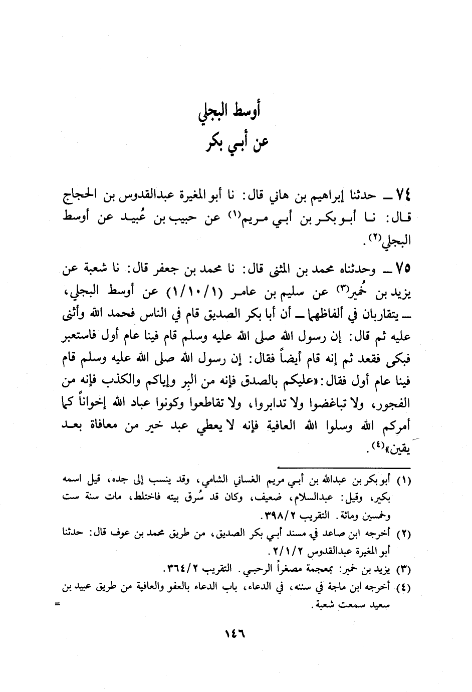 75 - وَحَدَّثَنَاهُ مُحَمَّدُ بْنُ الْمُثَنَّى قَالَ: نا مُحَمَّدُ بْنُ جَعْفَرٍ قَالَ: نا شُعْبَةُ، عَنْ يَزِيدَ بْنِ خُمَيْرٍ، عَنْ سُلَيْمِ بْنِ عَامِرٍ، عَنْ أَوْسَطَ الْبَجَلِيِّ، يَتَقَارَبَانِ فِي أَلْفَاظِهِمَا أَنَّ أَبَا بَكْرٍ الصِّدِّيقَ، قَامَ فِي النَّاسِ فَحَمِدَ اللَّهَ وَأَثْنَى عَلَيْهِ ثُمَّ قَالَ: إِنَّ رَسُولَ اللَّهِ صَلَّى اللهُ عَلَيْهِ وَسَلَّمَ قَامَ فِينَا عَامَ أَوَّلَ فَاسْتَعْبَرَ فَبَكَى فَقَعَدَ، ثُمَّ إِنَّهُ قَامَ أَيْضًا فَقَالَ: إِنَّ رَسُولَ اللَّهِ صَلَّى اللهُ عَلَيْهِ وَسَلَّمَ قَامَ فِينَا عَامَ أَوَّلَ فَقَالَ: «§عَلَيْكُمْ بِالصِّدْقِ فَإِنَّهُ مِنَ الْبِرِّ، وَإِيَّاكُمْ وَالْكَذِبَ فَإِنَّهُ مِنَ الْفُجُورِ، وَلَا تَبَاغَضُوا، وَلَا تَدَابَرُوا، وَلَا تَقَاطَعُوا، وَكُونُوا عِبَادَ اللَّهِ إِخْوَانًا، كَمَا أَمَرَكُمُ اللَّهُ، وَسَلُوا اللَّهَ الْعَافِيَةَ فَإِنَّهُ لَا يُعْطَى عَبْدٌ خَيْرًا مِنْ مُعَافَاةٍ بَعْدَ يَقِينٍ» -[147]- قَالَ أَبُو بَكْرٍ: وَهَذَا الْحَدِيثُ لَا نَعْلَمُهُ يُرْوَى بِهَذِهِ الْأَلْفَاظِ عَنِ النَّبِيِّ صَلَّى اللهُ عَلَيْهِ وَسَلَّمَ إِلَّا عَنْ أَبِي بَكْرٍ عَنْهُ، وَهَذَا الْإِسْنَادُ مِنَ الْأَسَانِيدِ الْحِسَانِ -[148]- الَّتِي عَنْ أَبِي بَكْرٍ، وَلَا نَعْلَمُ رَوَى أَوْسَطُ عَنْ أَبِي بَكْرٍ عَنِ النَّبِيِّ صَلَّى اللهُ عَلَيْهِ وَسَلَّمَ إِلَّا هَذَا الْحَدِيثَ وَأَوْسَطُ الْبَجَلِيُّ لَا نَعْلَمُ رَوَى إِلَّا عَنْ أَبِي بَكْرٍ، وَلَا نَعْلَمُ رَوَى عَنْ أَوْسَطَ إِلَّا سُلَيْمُ بْنُ عَامِرٍ