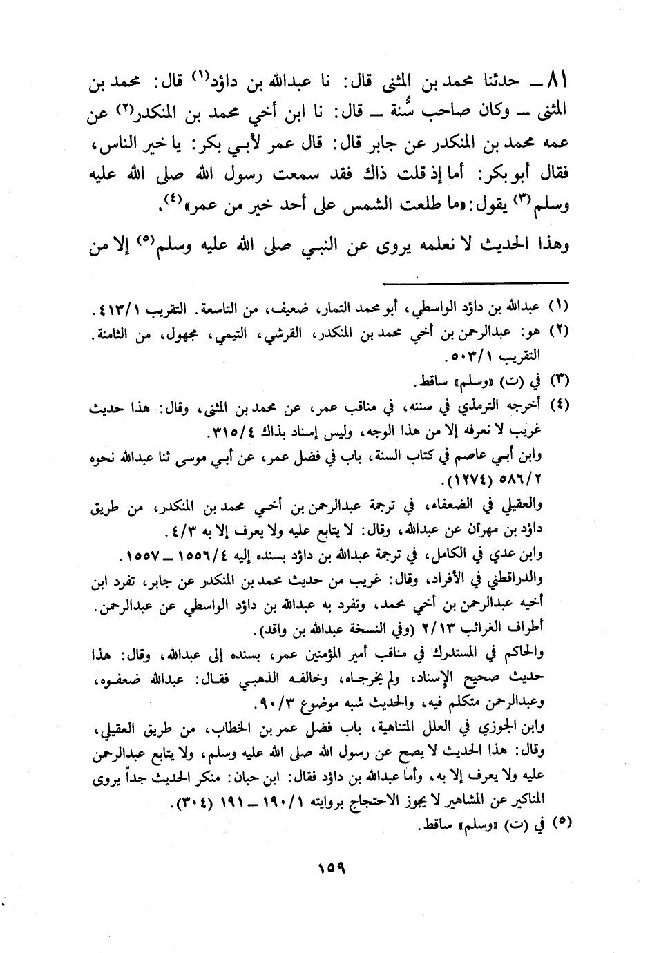 81 - حَدَّثَنَا مُحَمَّدُ بْنُ الْمُثَنَّى قَالَ: نا عَبْدُ اللَّهِ بْنُ دَاوُدَ قَالَ: مُحَمَّدُ بْنُ الْمُثَنَّى وَكَانَ صَاحِبَ سُنَّةٍ قَالَ: نا ابْنُ أَخِي مُحَمَّدِ بْنِ الْمُنْكَدِرِ، عَنْ عَمِّهِ مُحَمَّدِ بْنِ الْمُنْكَدِرِ، عَنْ جَابِرٍ قَالَ: قَالَ عُمَرُ لِأَبِي بَكْرٍ: يَا خَيْرَ النَّاسِ، فَقَالَ أَبُو بَكْرٍ: أَمَا إِذْ قُلْتَ ذَاكَ فَقَدْ سَمِعْتُ رَسُولَ اللَّهَ صَلَّى اللهُ عَلَيْهِ وَسَلَّمَ يَقُولُ: «§مَا طَلَعَتِ الشَّمْسُ عَلَى أَحَدٍ خَيْرٍ مِنْ عُمَرَ» وَهَذَا الْحَدِيثُ لَا نَعْلَمُهُ يُرْوَى عَنِ النَّبِيِّ صَلَّى اللهُ عَلَيْهِ وَسَلَّمَ إِلَّا مِنْ -[160]- هَذَا الْوَجْهِ، وَابْنُ أَخِي مُحَمَّدِ بْنِ الْمُنْكَدِرِ لَا نَعْلَمُ حَدَّثَ عَنْهُ، إِلَّا عَبْدُ اللَّهِ بْنُ دَاوُدَ الْوَاسِطِيُّ وَإِنَّمَا احْتَمَلَ هَذَا الْحَدِيثَ عَلَى مَا فِي إِسْنَادِهِ إِذْ كَانَ فَضِيلَةً لِعُمَرَ رَضِيَ اللَّهُ عَنْهُ