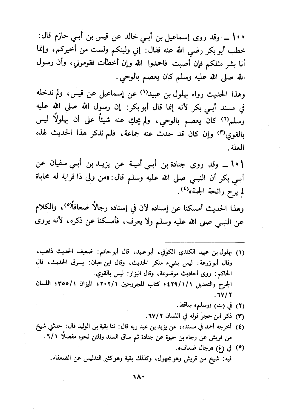 101 - وَقَدْ رَوَى جُنَادَةُ بْنُ أَبِي أُمَيَّةَ، عَنْ يَزِيدَ بْنِ أَبِي سُفْيَانَ، عَنْ أَبِي بَكْرٍ، أَنَّ النَّبِيَّ صَلَّى اللهُ عَلَيْهِ وَسَلَّمَ قَالَ: «§مَنْ وَلَّى ذَا قَرَابَةٍ لَهُ مُحَابَاةً لَمْ يَرَحْ رَائِحَةَ الْجَنَّةِ» وَهَذَا الْحَدِيثُ أَمْسَكْنَا عَنْ إِسْنَادِهِ لِأَنَّ فِي إِسْنَادِهِ رِجَالًا ضِعَافًا، وَالْكَلَامُ عَنِ النَّبِيِّ صَلَّى اللهُ عَلَيْهِ وَسَلَّمَ وَلَا يُعْرَفُ فَأَمْسَكْنَا عَنْ ذِكْرِهِ لِأَنَّهُ يُرْوَى -[181]- عَنِ النَّبِيِّ صَلَّى اللهُ عَلَيْهِ وَسَلَّمَ أَنَّهُ قَالَ: «مَنْ حَدَّثَ عَنِّي حَدِيثًا وَهُوَ يَرَى أَنَّهُ كَذِبٌ فَهُوَ أَحَدُ الْكَاذِبِينَ» . وَلَوْ ذَهَبْنَا أَنْ نَتَتَبَّعَ الْأَحَادِيثَ الَّتِي كَلَامُهَا عَنْ غَيْرِ أَبِي بَكْرٍ عَنِ النَّبِيِّ صَلَّى اللهُ عَلَيْهِ وَسَلَّمَ وَإِنَّمَا لِأَبِي بَكْرٍ فِيهِ كَلِمَةٌ يَذْكُرُهَا عَنِ النَّبِيِّ صَلَّى اللهُ عَلَيْهِ وَسَلَّمَ تَأَوَّلَهَا مُتَأَوِّلٌ بِذِكْرِ أَبِي بَكْرٍ لَكَثُرَ ذَلِكَ، أَوْ لَوْ ذَكَرْنَا كُلَّ مَا رُوِيَ عَنْ أَبِي بَكْرٍ مُرْسَلٌ وَمُنْكَرٌ وَضَعِيفُ الْإِسْنَادِ إِلَى أَبِي بَكْرٍ لَكَثُرَ ذَلِكَ وَقَبُحَ الْمُسْنَدُ، فَذَكَرْنَا مِنْ ذَلِكَ مَا لَا يَعِيبُهُ الْحَلِيمُ مِنْ أَصْحَابِ الْحَدِيثِ وَلَا يَتَعَجَّبُ مِنْهُ الْجَاهِلُ