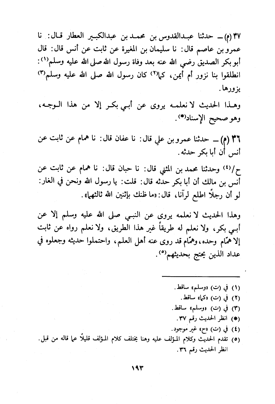 حَدَّثَنَا عَمْرُو بْنُ عَلِيٍّ قَالَ: نا عَفَّانُ قَالَ: نا هَمَّامٌ، عَنْ ثَابِتٍ، عَنْ أَنَسٍ: أَنَّ أَبَا بَكْرٍ، حَدَّثَهُ، ح وَحَدَّثَنَا مُحَمَّدُ بْنُ الْمُثَنَّى قَالَ: نا حِبَّانُ، قَالَ: نا هَمَّامٌ، عَنْ ثَابِتٍ، عَنْ أَنَسِ بْنِ مَالِكٍ، أَنَّ أَبَا بَكْرٍ، حَدَّثَهُ قَالَ: قُلْتُ يَا رَسُولَ اللَّهِ، وَنَحْنُ فِي الْغَارِ لَوْ أَنَّ رَجُلًا اطَّلَعَ لَرَآنَا، قَالَ: «§مَا ظَنُّكَ بِاثْنَيْنِ اللَّهُ ثَالِثُهُمَا» . وَهَذَا الْحَدِيثُ لَا نَعْلَمُهُ يُرْوَى عَنِ النَّبِيِّ صَلَّى اللهُ عَلَيْهِ وَسَلَّمَ إِلَّا عَنْ أَبِي بَكْرٍ، وَلَا نَعْلَمُ لَهُ طَرِيقًا غَيْرَ هَذَا الطَّرِيقِ، وَلَا نَعْلَمُ رَوَاهُ عَنْ ثَابِتٍ إِلَّا هَمَّامٌ وَحْدَهُ، وَهَمَّامٌ قَدْ رَوَى عَنْهُ أَهْلُ الْعِلْمِ وَاحْتَمَلُوا حَدِيثَهُ وَجَعَلُوهُ فِي عِدَادِ الَّذِينَ يُحْتَجُّ بِحَدِيثِهِمْ