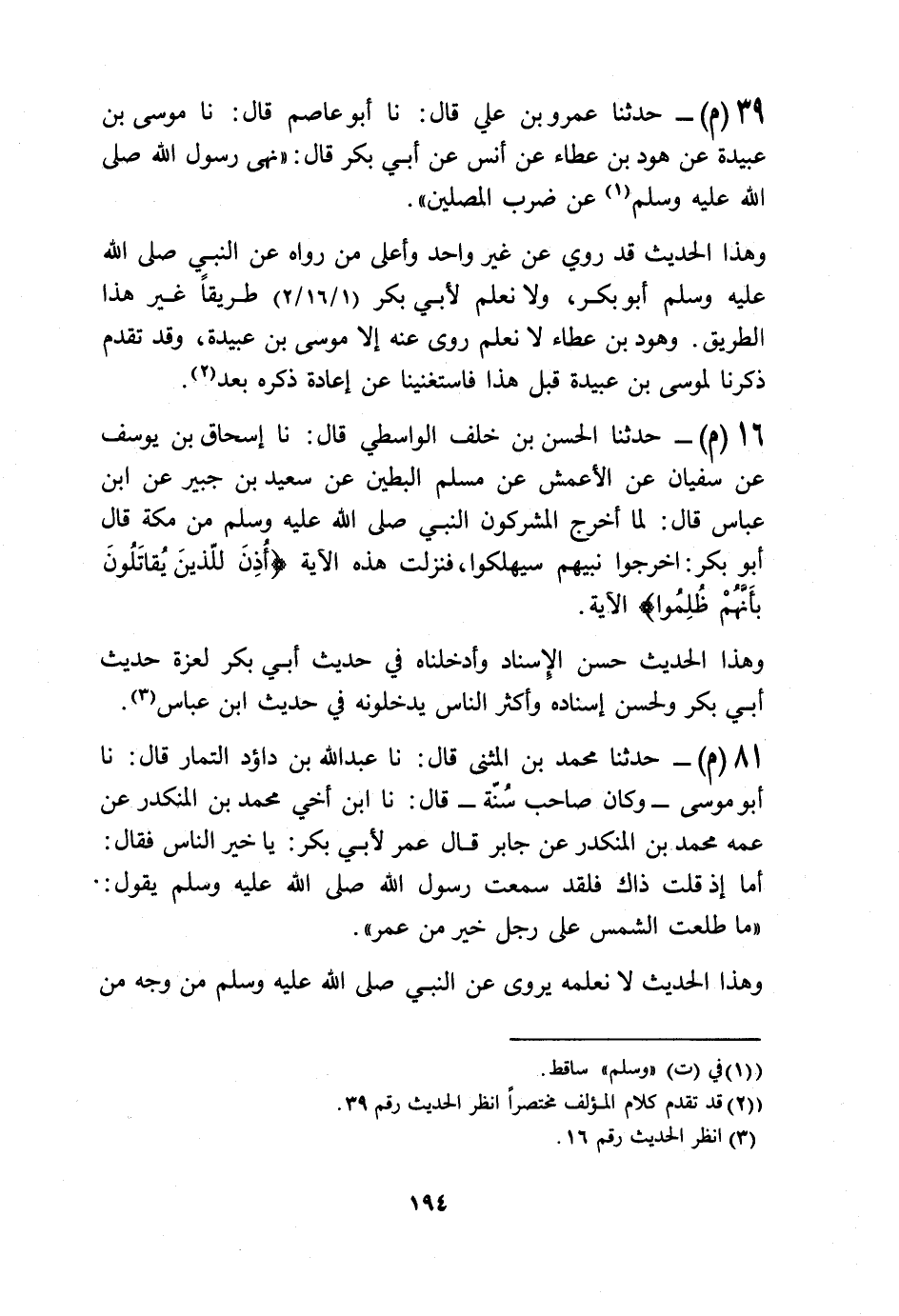 حَدَّثَنَا عَمْرُو بْنُ عَلِيٍّ قَالَ: نا أَبُو عَاصِمٍ قَالَ: نا مُوسَى بْنُ عُبَيْدَةَ، عَنْ هُودِ بْنِ عَطَاءٍ، عَنْ أَنَسٍ، عَنْ أَبِي بَكْرٍ قَالَ: «§نَهَى رَسُولُ اللَّهِ صَلَّى اللهُ عَلَيْهِ وَسَلَّمَ عَنْ ضَرْبِ الْمُصَلِّينِ» وَهَذَا الْحَدِيثُ قَدْ رُوِيَ عَنْ غَيْرِ وَاحِدٍ، وَأَعْلَى مَنْ رَوَاهُ عَنِ النَّبِيِّ صَلَّى اللهُ عَلَيْهِ وَسَلَّمَ أَبُو بَكْرٍ، وَلَا نَعْلَمُ لِأَبِي بَكْرٍ طَرِيقًا غَيْرَ هَذَا الطَّرِيقِ، وَهُودُ بْنُ عَطَاءٍ لَا نَعْلَمُ رَوَى عَنْهُ إِلَّا مُوسَى بْنُ عُبَيْدَةَ، وَقَدْ تَقَدَّمَ ذِكْرُنَا لِمُوسَى بْنِ عُبَيْدَةَ قَبْلَ هَذَا، فَاسْتَغْنَيْنَا عَنْ إِعَادَةِ ذِكْرِهِ بَعْدُ
