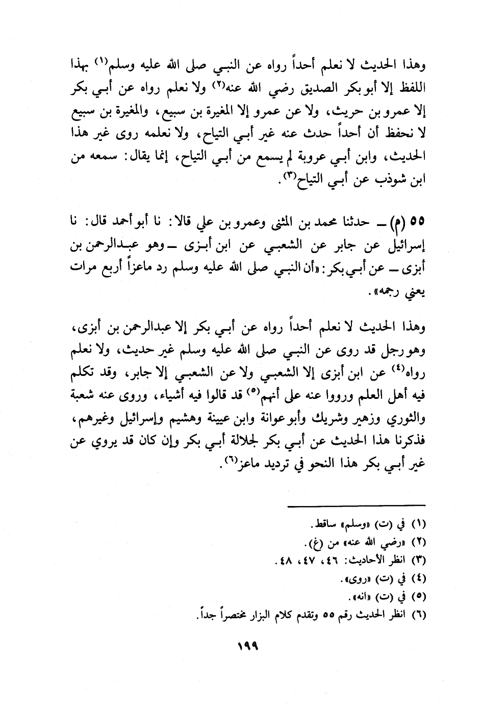 حَدَّثَنَا مُحَمَّدُ بْنُ الْمُثَنَّى، وَعَمْرُو بْنُ عَلِيٍّ قَالَا: نا أَبُو أَحْمَدَ قَالَ: نا إِسْرَائِيلُ، عَنْ جَابِرٍ، عَنِ الشَّعْبِيِّ، عَنِ ابْنِ أَبْزَى وَهُوَ عَبْدُ الرَّحْمَنِ بْنُ أَبْزَى، عَنْ أَبِي بَكْرٍ، " أَنَّ النَّبِيَّ صَلَّى اللهُ عَلَيْهِ وَسَلَّمَ §رَدَّ مَاعِزًا أَرْبَعَ مَرَّاتٍ، يَعْنِي: رَجَمَهُ " وَهَذَا الْحَدِيثُ لَا نَعْلَمُ أَحَدًا رَوَاهُ عَنْ أَبِي بَكْرٍ إِلَّا عَبْدُ الرَّحْمَنِ بْنُ أَبْزَى، وَهُوَ رَجُلٌ قَدْ رَوَى عَنِ النَّبِيِّ صَلَّى اللهُ عَلَيْهِ وَسَلَّمَ غَيْرَ حَدِيثٍ، وَلَا نَعْلَمُ رَوَاهُ عَنِ ابْنِ أَبْزَى، إِلَّا الشَّعْبِيُّ، وَلَا عَنِ الشَّعْبِيِّ إِلَّا جَابِرٌ، وَقَدْ تَكَلَّمَ فِيهِ أَهْلُ الْعِلْمِ وَرَوَوْا عَنْهُ عَلَى أَنَّهُمْ قَدْ قَالُوا فِيهِ أَشْيَاءَ، وَرَوَى عَنْهُ شُعْبَةُ، وَالثَّوْرِيُّ، وَزُهَيْرٌ، وَشَرِيكٌ، وَأَبُو عَوَانَةَ، وَابْنُ عُيَيْنَةَ، وَهُشَيْمٌ، وَإِسْرَائِيلُ، وَغَيْرُهُمْ. فَذَكَرْنَا هَذَا الْحَدِيثَ عَنْ أَبِي بَكْرٍ لِجَلَالَةِ أَبِي بَكْرٍ وَإِنْ كَانَ قَدْ يُرْوَى عَنْ غَيْرِ أَبِي بَكْرٍ هَذَا النَّحْوُ فِي تَرْدِيدِ مَاعِزٍ