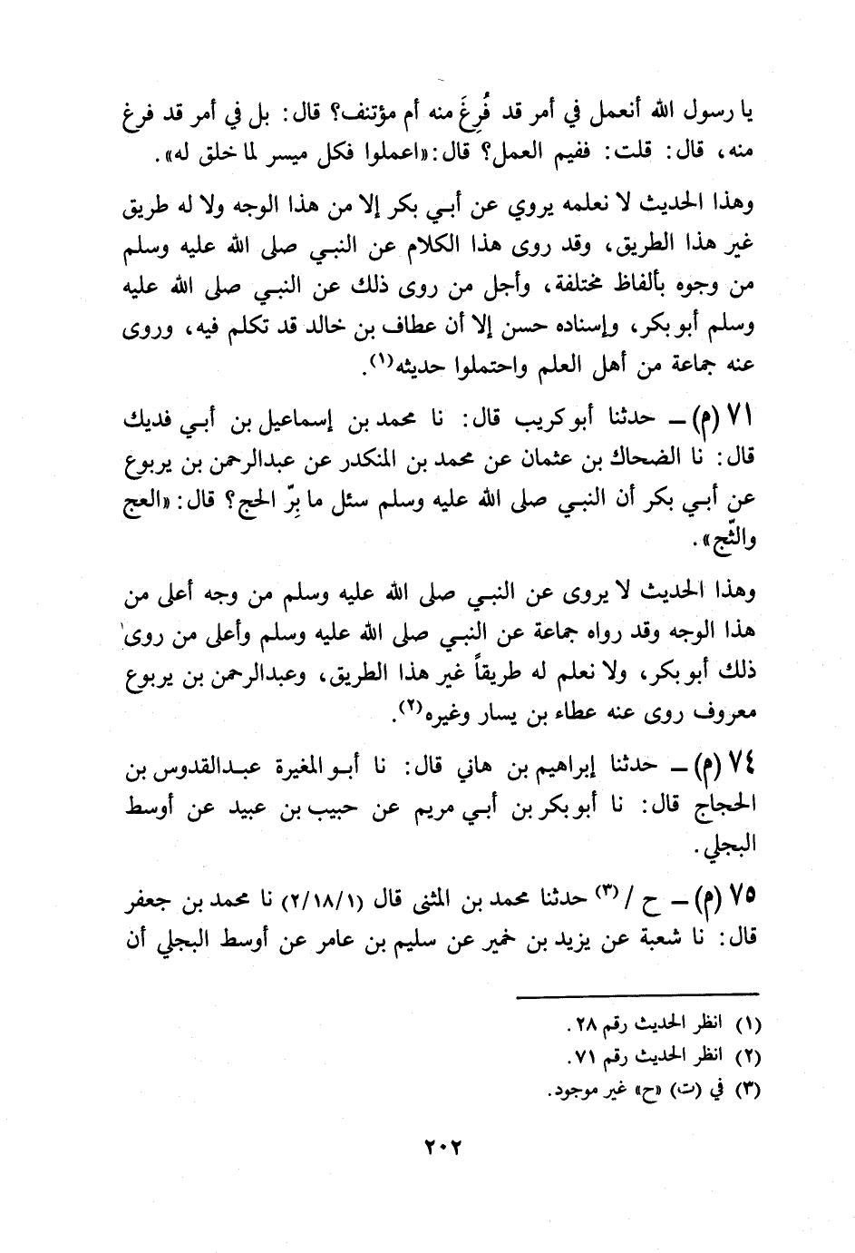 حَدَّثَنَا أَبُو كُرَيْبٍ قَالَ: نا مُحَمَّدُ بْنُ إِسْمَاعِيلَ بْنِ أَبِي فُدَيْكٍ قَالَ: نا الضَّحَّاكُ بْنُ عُثْمَانَ، عَنْ مُحَمَّدِ بْنِ الْمُنْكَدِرِ، عَنْ عَبْدِ الرَّحْمَنِ بْنِ يَرْبُوعٍ، عَنْ أَبِي بَكْرٍ، أَنَّ النَّبِيَّ صَلَّى اللهُ عَلَيْهِ وَسَلَّمَ §سُئِلَ: مَا بِرُّ الْحَجِّ؟ قَالَ: «الْعَجُّ وَالثَّجُّ» وَهَذَا الْحَدِيثُ لَا يُرْوَى عَنِ النَّبِيِّ صَلَّى اللهُ عَلَيْهِ وَسَلَّمَ مِنْ وَجْهٍ أَعْلَى مِنْ هَذَا الْوَجْهِ، وَقَدْ رَوَاهُ جَمَاعَةٌ عَنِ النَّبِيِّ صَلَّى اللهُ عَلَيْهِ وَسَلَّمَ، وَأَعْلَى مَنْ رَوَى ذَلِكَ أَبُو بَكْرٍ، وَلَا نَعْلَمُ لَهُ طَرِيقًا غَيْرَ هَذَا الطَّرِيقِ، وَعَبْدُ الرَّحْمَنِ بْنُ يَرْبُوعٍ مَعْرُوفٌ، رَوَى عَنْهُ عَطَاءُ بْنُ يَسَارٍ وَغَيْرُهُ