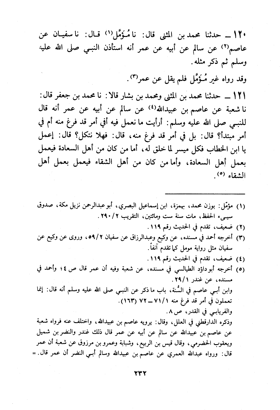 121 - حَدَّثَنَا مُحَمَّدُ بْنُ الْمُثَنَّى، وَمُحَمَّدُ بْنُ بَشَّارٍ قَالَا: نا مُحَمَّدُ بْنُ جَعْفَرٍ قَالَ: نا شُعْبَةُ، عَنْ عَاصِمِ بْنِ عُبَيْدِ اللَّهِ، عَنْ سَالِمٍ، عَنْ أَبِيهِ، عَنْ عُمَرَ أَنَّهُ قَالَ لِلنَّبِيِّ صَلَّى اللهُ عَلَيْهِ وَسَلَّمَ: أَرَأَيْتَ مَا نَعْمَلُ فِيهِ أَفِي أَمْرٍ قَدْ فُرِغَ مِنْهُ أَمْ فِي أَمْرٍ مُبْتَدَإٍ؟ قَالَ: " §بَلْ فِي أَمْرٍ قَدْ فُرِغَ مِنْهُ، قَالَ: فَهَلَّا نَتَّكِلُ؟ قَالَ: «اعْمَلْ يَا ابْنَ الْخَطَّابِ فَكُلٌّ مُيَسَّرٌ لِمَا خُلِقَ لَهُ، أَمَّا مَنْ كَانَ مِنْ أَهْلِ السَّعَادَةِ فَيَعْمَلُ بِعَمَلِ أَهْلِ السَّعَادَةِ، وَأَمَّا مَنْ كَانَ مِنْ أَهْلِ الشَّقَاءِ فَيَعْمَلُ بِعَمَلِ أَهْلِ الشَّقَاءِ» -[233]-. وَهَذَا الْحَدِيثُ قَدْ رُوِيَ عَنْ عُمَرَ مِنْ غَيْرِ وَجْهٍ