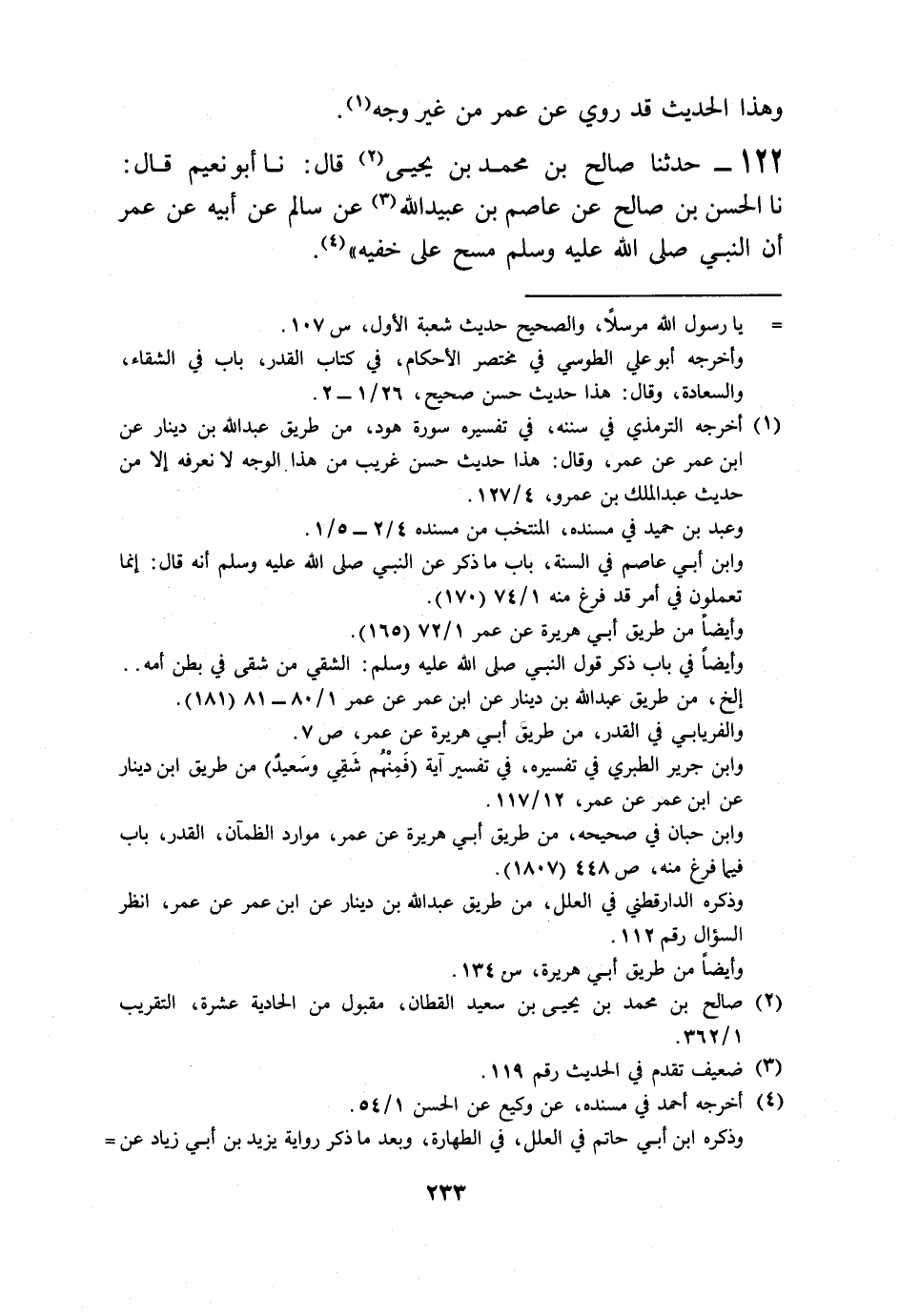 122 - حَدَّثَنَا صَالِحُ بْنُ مُحَمَّدِ بْنِ يَحْيَى قَالَ: نا أَبُو نُعَيْمٍ قَالَ: نا الْحَسَنُ بْنُ صَالِحٍ، عَنْ عَاصِمِ بْنِ عُبَيْدِ اللَّهِ، عَنْ سَالِمٍ، عَنْ أَبِيهِ، عَنْ عُمَرَ «أَنَّ النَّبِيَّ صَلَّى اللهُ عَلَيْهِ وَسَلَّمَ §مَسَحَ عَلَى خُفَّيْهِ» -[234]-. هَكَذَا رَوَاهُ الْحَسَنُ بْنُ صَالِحٍ، عَنْ عَاصِمِ بْنِ عُبَيْدِ اللَّهِ، وَقَدْ رُوِيَ عَنْ عَاصِمٍ، بِخِلَافِ هَذَا الْإِسْنَادِ
