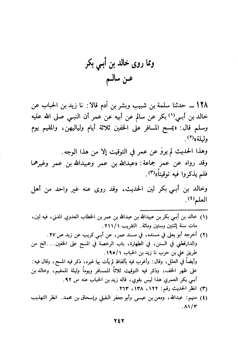 128 - حَدَّثَنَا سَلَمَةُ بْنُ شَبِيبٍ، وَبِشْرُ بْنُ آدَمَ قَالَا: نا زَيْدُ بْنُ الْحُبَابِ، عَنْ خَالِدِ بْنِ أَبِي بَكْرٍ، عَنْ سَالِمٍ، عَنْ أَبِيهِ، عَنْ عُمَرَ أَنَّ النَّبِيَّ صَلَّى اللهُ عَلَيْهِ وَسَلَّمَ قَالَ: «§يَمْسَحُ الْمُسَافِرُ عَلَى الْخُفَّيْنِ ثَلَاثَةَ أَيَّامٍ وَلَيَالِيهِنَّ، وَالْمُقِيمُ يَوْمًا وَلَيْلَةً» وَهَذَا الْحَدِيثُ لَمْ يُرْوَ عَنْ عُمَرَ فِي التَّوْقِيتِ إِلَّا مِنْ هَذَا الْوَجْهِ، وَقَدْ رَوَاهُ عَنْ عُمَرَ جَمَاعَةٌ: عَبْدُ اللَّهِ بْنُ عُمَرَ، وَعُبَيْدُ اللَّهِ بْنُ عُمَرَ وَغَيْرُهُمَا فَلَمْ يَذْكُرُوا فِيهِ تَوْقِيتًا، وَخَالِدُ بْنُ أَبِي بَكْرٍ لَيِّنُ الْحَدِيثِ، وَقَدْ رَوَى عَنْهُ غَيْرُ وَاحِدٍ مِنْ أَهْلِ الْعِلْمِ