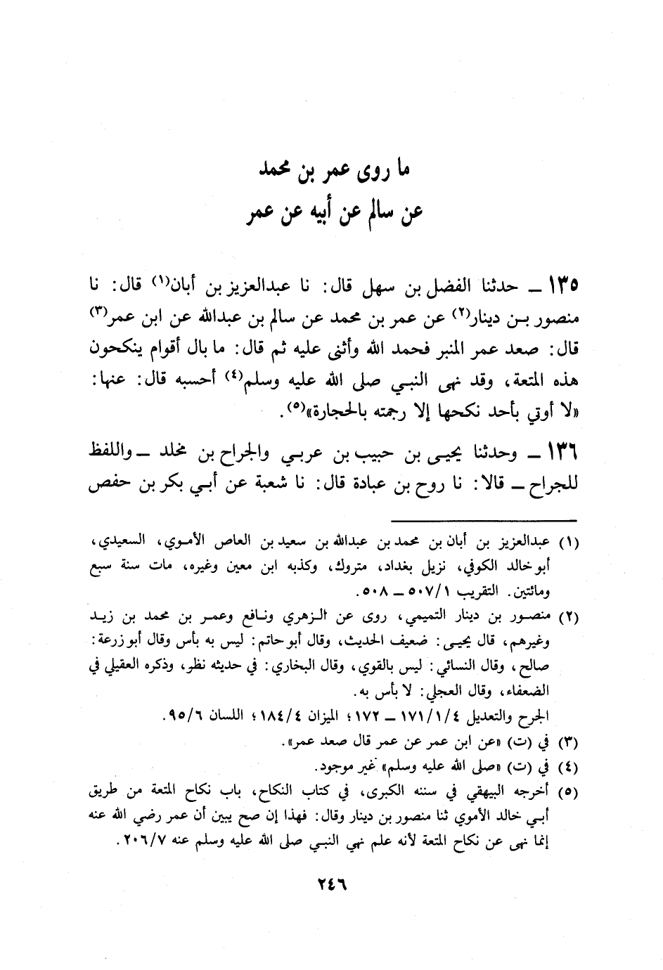 135 - حَدَّثَنَا الْفَضْلُ بْنُ سَهْلٍ قَالَ: نا عَبْدُ الْعَزِيزِ بْنُ أَبَانَ قَالَ: نا مَنْصُورُ بْنُ دِينَارٍ، عَنْ عُمَرَ بْنِ مُحَمَّدٍ، عَنْ سَالِمِ بْنِ عَبْدِ اللَّهِ، عَنِ ابْنِ عُمَرَ قَالَ: صَعِدَ عُمَرُ الْمِنْبَرَ فَحَمِدَ اللَّهَ وَأَثْنَى عَلَيْهِ، ثُمَّ قَالَ: مَا بَالُ أَقْوَامٍ يَنْكِحُونَ هَذِهِ الْمُتْعَةَ، وَقَدْ نَهَى النَّبِيُّ صَلَّى اللهُ عَلَيْهِ وَسَلَّمَ، أَحْسَبُهُ قَالَ عَنْهَا: «§لَا أُوتَى بِأَحَدٍ نَكَحَهَا إِلَّا رَجَمْتُهُ بِالْحِجَارَةِ»