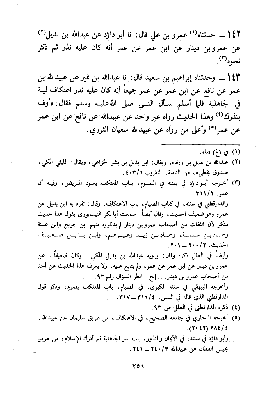 143 - وَحَدَّثَنَاهُ إِبْرَاهِيمُ بْنُ سَعِيدٍ قَالَ: نا عَبْدُ اللَّهِ بْنُ نُمَيْرٍ، عَنْ عُبَيْدِ اللَّهِ بْنِ عُمَرَ، عَنْ نَافِعٍ، عَنِ ابْنِ عُمَرَ، عَنْ عُمَرَ جَمِيعًا: أَنَّهُ كَانَ عَلَيْهِ نَذْرُ اعْتِكَافِ لَيْلَةٍ فِي الْجَاهِلِيَّةِ، فَلَمَّا أَسْلَمَ سَأَلَ النَّبِيَّ صَلَّى اللهُ عَلَيْهِ وَسَلَّمَ فَقَالَ: «§أَوْفِ بِنَذْرِكَ» وَهَذَا الْحَدِيثُ رَوَاهُ غَيْرُ وَاحِدٍ عَنْ عُبَيْدِ اللَّهِ، عَنْ نَافِعٍ، عَنِ ابْنِ عُمَرَ، عَنْ عُمَرَ، وَأَعْلَى مَنْ رَوَاهُ عَنْ عُبَيْدِ اللَّهِ، سُفْيَانُ الثَّوْرِيُّ