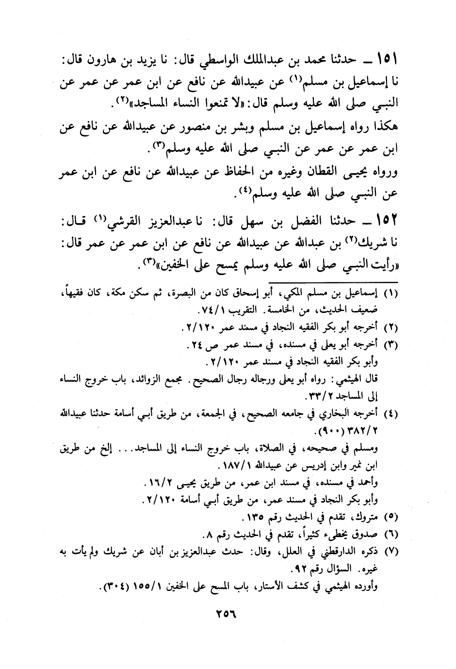 151 - حَدَّثَنَا مُحَمَّدُ بْنُ عَبْدِ الْمَلِكِ الْوَاسِطِيُّ قَالَ: نا يَزِيدُ بْنُ هَارُونَ قَالَ: نا إِسْمَاعِيلُ بْنُ مُسْلِمٍ، عَنْ عُبَيْدِ اللَّهِ، عَنْ نَافِعٍ، عَنِ ابْنِ عُمَرَ، عَنْ عُمَرَ، عَنِ النَّبِيِّ صَلَّى اللهُ عَلَيْهِ وَسَلَّمَ قَالَ: «§لَا تَمْنَعُوا النِّسَاءَ الْمَسَاجِدَ» هَكَذَا رَوَاهُ إِسْمَاعِيلُ بْنُ مُسْلِمٍ وَبِشْرُ بْنُ مَنْصُورٍ، عَنْ عُبَيْدِ اللَّهِ، عَنْ نَافِعٍ، عَنِ ابْنِ عُمَرَ، عَنْ عُمَرَ، عَنِ النَّبِيِّ صَلَّى اللهُ عَلَيْهِ وَسَلَّمَ، وَرَوَاهُ يَحْيَى الْقَطَّانُ وَغَيْرُهُ مِنَ الْحُفَّاظِ، عَنْ عُبَيْدِ اللَّهِ، عَنْ نَافِعٍ، عَنِ ابْنِ عُمَرَ عَنِ النَّبِيِّ صَلَّى اللهُ عَلَيْهِ وَسَلَّمَ