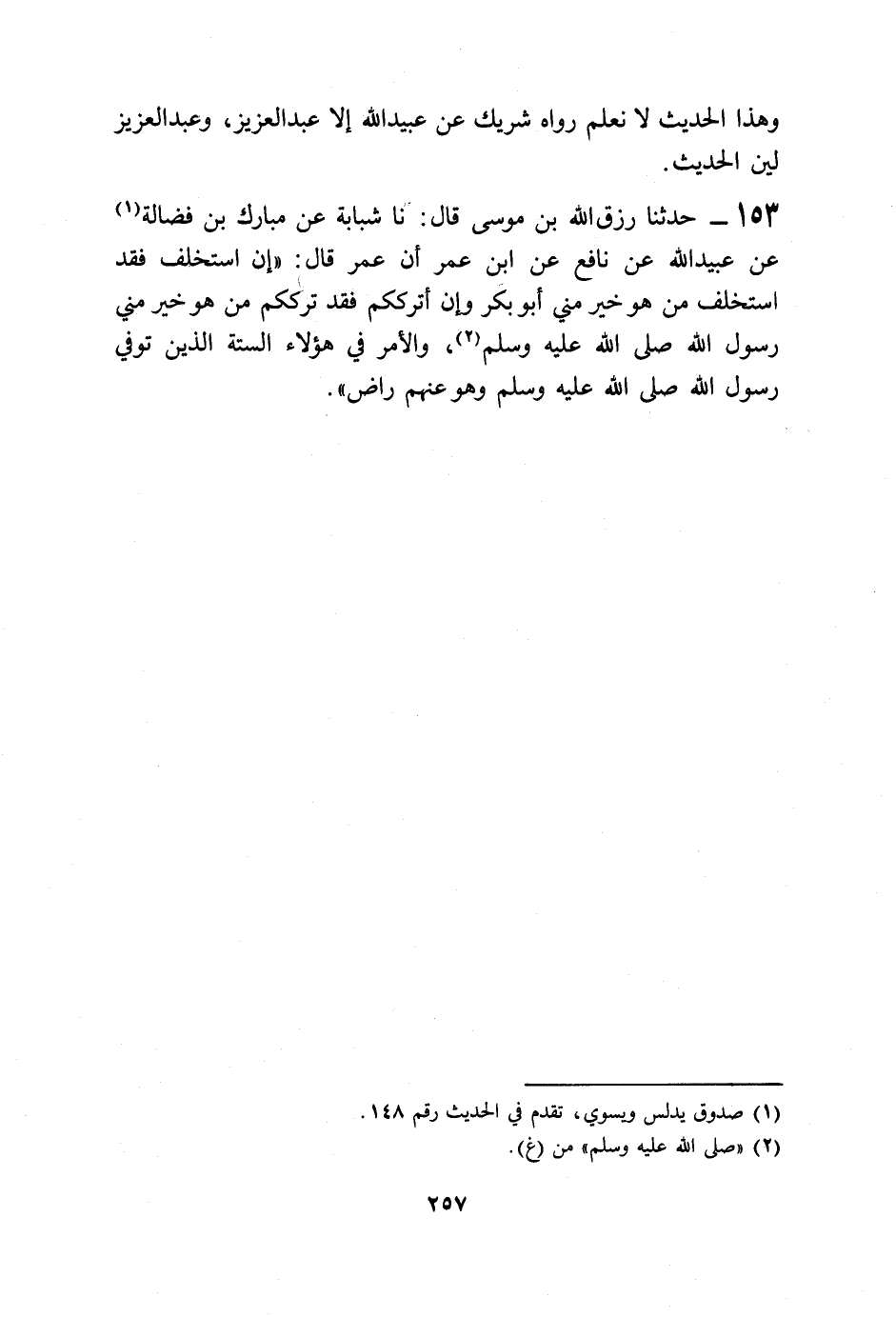 153 - حَدَّثَنَا رِزْقُ اللَّهِ بْنُ مُوسَى قَالَ: نا شَبَابَةُ، عَنْ مُبَارَكِ بْنِ فَضَالَةَ، عَنْ عُبَيْدِ اللَّهِ، عَنْ نَافِعٍ، عَنِ ابْنِ عُمَرَ، أَنَّ عُمَرَ قَالَ: «§إِنْ أَسْتَخْلِفْ فَقَدِ اسْتَخْلَفَ مَنْ هُوَ خَيْرٌ مِنِّي أَبُو بَكْرٍ، وَإِنْ أَتْرُكْكُمْ فَقَدْ تَرَكَكُمْ مَنْ هُوَ خَيْرٌ مِنِّي رَسُولُ اللَّهِ صَلَّى اللهُ عَلَيْهِ وَسَلَّمَ، وَالْأَمْرُ فِي هَؤُلَاءِ السِّتَّةِ الَّذِينَ تُوُفِّيَ رَسُولُ اللَّهِ صَلَّى اللهُ عَلَيْهِ وَسَلَّمَ وَهُوَ عَنْهُمْ رَاضٍ»