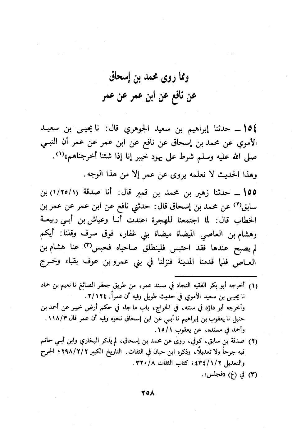 154 - حَدَّثَنَا إِبْرَاهِيمُ بْنُ سَعِيدٍ الْجَوْهَرِيُّ قَالَ: نا يَحْيَى بْنُ سَعِيدٍ الْأُمَوِيُّ، عَنْ مُحَمَّدِ بْنِ إِسْحَاقَ، عَنْ نَافِعٍ، عَنِ ابْنِ عُمَرَ، عَنْ عُمَرَ أَنَّ النَّبِيَّ صَلَّى اللهُ عَلَيْهِ وَسَلَّمَ شَرَطَ عَلَى يَهُودِ خَيْبَرَ: «§إِنَّا إِذَا شِئْنَا أَخْرَجْنَاهُمْ» . وَهَذَا الْحَدِيثُ لَا نَعْلَمُهُ يُرْوَى عَنْ عُمَرَ إِلَّا مِنْ هَذَا الْوَجْهِ