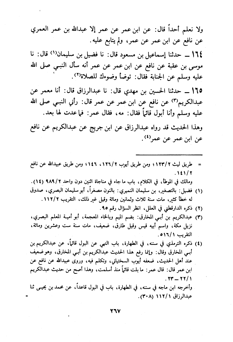165 - حَدَّثَنَا الْحُسَيْنُ بْنُ مَهْدِيٍّ قَالَ: نا عَبْدُ الرَّزَّاقِ قَالَ: أنا مَعْمَرٌ، عَنْ عَبْدِ الْكَرِيمِ، عَنْ نَافِعٍ، عَنِ ابْنِ عُمَرَ، عَنْ عُمَرَ قَالَ: §رَآنِي النَّبِيُّ صَلَّى اللهُ عَلَيْهِ وَسَلَّمَ وَأَنَا أَبُولُ قَائِمًا فَقَالَ: «مَهْ» . فَقَالَ عُمَرُ: فَمَا عُدْتُ لَهَا بَعْدُ. وَهَذَا الْحَدِيثُ قَدْ رَوَاهُ عَبْدُ الرَّزَّاقِ، عَنِ ابْنِ جُرَيْجٍ، عَنْ عَبْدِ الْكَرِيمِ، عَنْ نَافِعٍ، عَنِ ابْنِ عُمَرَ، عَنْ عُمَرَ -[268]-، وَعَنْ مَعْمَرٍ، عَنْ عَبْدِ الْكَرِيمِ، عَنْ نَافِعٍ، عَنِ ابْنِ عُمَرَ، عَنْ عُمَرَ