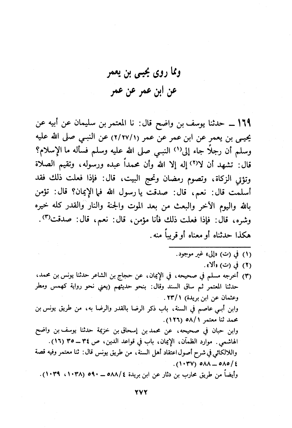 169 - حَدَّثَنَا يُوسُفُ بْنُ وَاضِحٍ قَالَ: نا الْمُعْتَمِرُ بْنُ سُلَيْمَانَ، عَنْ أَبِيهِ، عَنْ يَحْيَى بْنِ يَعْمَرَ، عَنِ ابْنِ عُمَرَ، عَنْ عُمَرَ، عَنِ النَّبِيِّ صَلَّى اللهُ عَلَيْهِ وَسَلَّمَ: أَنَّ رَجُلًا جَاءَ إِلَى النَّبِيِّ صَلَّى اللهُ عَلَيْهِ وَسَلَّمَ فَسَأَلَهُ: §مَا الْإِسْلَامُ؟ قَالَ: «تَشْهَدُ أَنْ لَا إِلَهَ إِلَّا اللَّهُ وَأَنَّ مُحَمَّدًا عَبْدُهُ وَرَسُولُهُ، وَتُقِيمُ الصَّلَاةَ، وَتُؤْتِي الزَّكَاةَ، وَتَصُومُ رَمَضَانَ، وَتَحُجُّ الْبَيْتَ» . قَالَ: فَإِذَا فَعَلْتُ ذَلِكَ فَقَدْ أَسْلَمْتُ؟ قَالَ: «نَعَمْ» ، قَالَ: صَدَقْتَ يَا رَسُولَ اللَّهِ. فَمَا الْإِيمَانُ؟ قَالَ: «تُؤْمِنُ بِاللَّهِ، وَالْيَوْمِ الْآخِرِ، وَالْبَعْثِ مِنْ بَعْدِ الْمَوْتِ، وَالْجَنَّةِ وَالنَّارِ، وَالْقَدَرِ كُلِّهِ خَيْرِهِ وَشَرِّهِ» . قَالَ: فَإِذَا فَعَلْتُ ذَلِكَ فَأَنَا مُؤْمِنٌ؟ قَالَ: «نَعَمْ» ، قَالَ: صَدَقْتَ. هَكَذَا حَدَّثَنَاهُ أَوْ مَعْنَاهُ أَوْ قَرِيبًا مِنْهُ