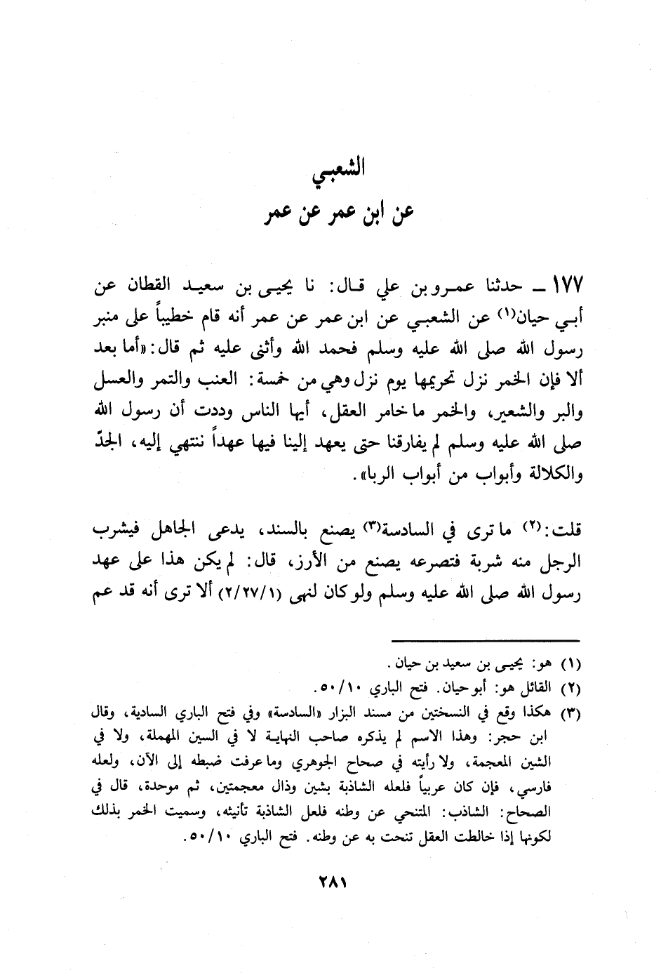 177 - حَدَّثَنَا عَمْرُو بْنُ عَلِيٍّ قَالَ: نا يَحْيَى بْنُ سَعِيدٍ الْقَطَّانُ، عَنْ أَبِي حَيَّانَ، عَنِ الشَّعْبِيِّ، عَنِ ابْنِ عُمَرَ، عَنْ عُمَرَ، أَنَّهُ قَامَ خَطِيبًا عَلَى مِنْبَرِ رَسُولِ اللَّهِ صَلَّى اللهُ عَلَيْهِ وَسَلَّمَ فَحَمِدَ اللَّهَ وَأَثْنَى عَلَيْهِ ثُمَّ قَالَ: أَمَّا بَعْدُ أَلَا §فَإِنَّ الْخَمْرَ نَزَلَ تَحْرِيمُهَا يَوْمَ نَزَلَ وَهِيَ مِنْ خَمْسَةٍ: الْعِنَبِ، وَالتَّمْرِ، وَالْعَسَلِ، وَالْبُرِّ وَالشَّعِيرِ، وَالْخَمْرُ مَا خَامَرَ الْعَقْلَ، أَيُّهَا النَّاسُ وَدِدْتُ أَنَّ رَسُولَ اللَّهِ صَلَّى اللهُ عَلَيْهِ وَسَلَّمَ لَمْ يُفَارِقْنَا حَتَّى يَعْهَدَ إِلَيْنَا فِيهَا عَهْدًا نَنْتَهِي إِلَيْهِ، الْجَدُّ، وَالْكَلَالَةُ، وَأَبْوَابٌ مِنْ أَبْوَابِ الرِّبَا " قُلْتُ: مَا تَرَى فِي السَّادِسَةِ يُصْنَعُ بِالسِّنْدِ يُدْعَى الْجَاهِلُ فَيَشْرَبُ الرَّجُلُ مِنْهُ شَرْبَةً فَتَصْرَعُهُ، يُصْنَعُ مِنَ الْأُرْزِ، قَالَ: لَمْ يَكُنْ هَذَا عَلَى عَهْدِ رَسُولِ اللَّهِ صَلَّى اللهُ عَلَيْهِ وَسَلَّمَ وَلَوْ كَانَ لَنَهَى أَلَا تَرَى أَنَّهُ قَدْ عَمَّ -[282]- الْأَشْرِبَةَ كُلَّهَا؟ فَقَالَ: «الْخَمْرُ مَا خَامَرَ الْعَقْلَ» وَهَذَا الْكَلَامُ لَا نَعْلَمُ رَوَاهُ عَنِ النَّبِيِّ صَلَّى اللهُ عَلَيْهِ وَسَلَّمَ إِلَّا عُمَرُ، وَإِسْنَادُهُ صَحِيحٌ