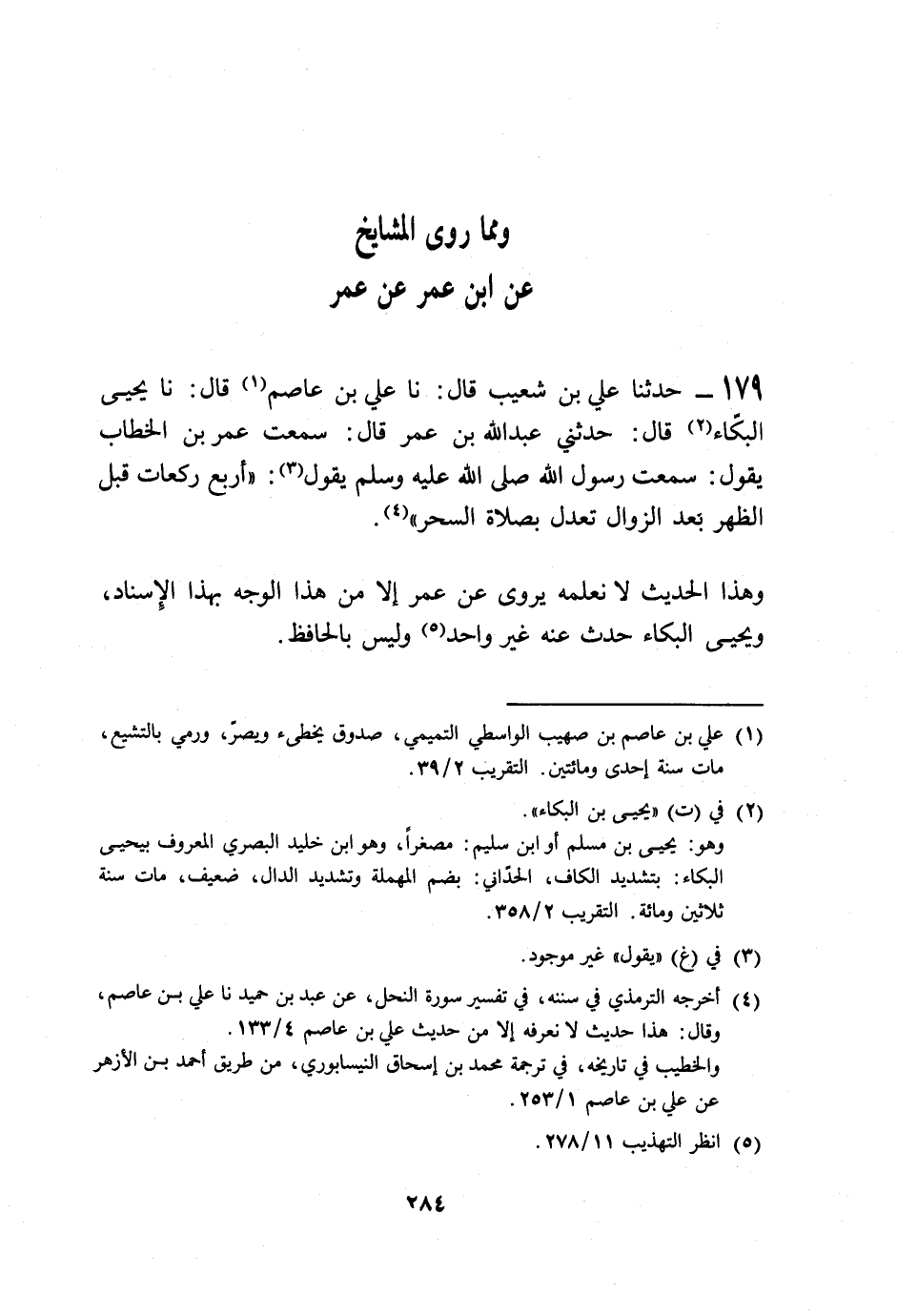 179 - حَدَّثَنَا عَلِيُّ بْنُ شُعَيْبٍ قَالَ: نا عَلِيُّ بْنُ عَاصِمٍ قَالَ: نا يَحْيَى الْبَكَّاءُ قَالَ: حَدَّثَنِي عَبْدُ اللَّهِ بْنُ عُمَرَ قَالَ: سَمِعْتُ عُمَرَ بْنَ الْخَطَّابِ يَقُولُ: سَمِعْتُ رَسُولَ اللَّهِ صَلَّى اللهُ عَلَيْهِ وَسَلَّمَ يَقُولُ: «§أَرْبَعُ رَكَعَاتٍ قَبْلَ الظُّهْرِ بَعْدَ الزَّوَالِ تَعْدِلُ بِصَلَاةِ السَّحَرِ» وَهَذَا الْحَدِيثُ لَا نَعْلَمُهُ يُرْوَى عَنْ عُمَرَ إِلَّا مِنْ هَذَا الْوَجْهِ بِهَذَا الْإِسْنَادِ، وَيَحْيَى الْبَكَّاءُ حَدَّثَ عَنْهُ غَيْرُ وَاحِدٍ وَلَيْسَ بِالْحَافِظِ