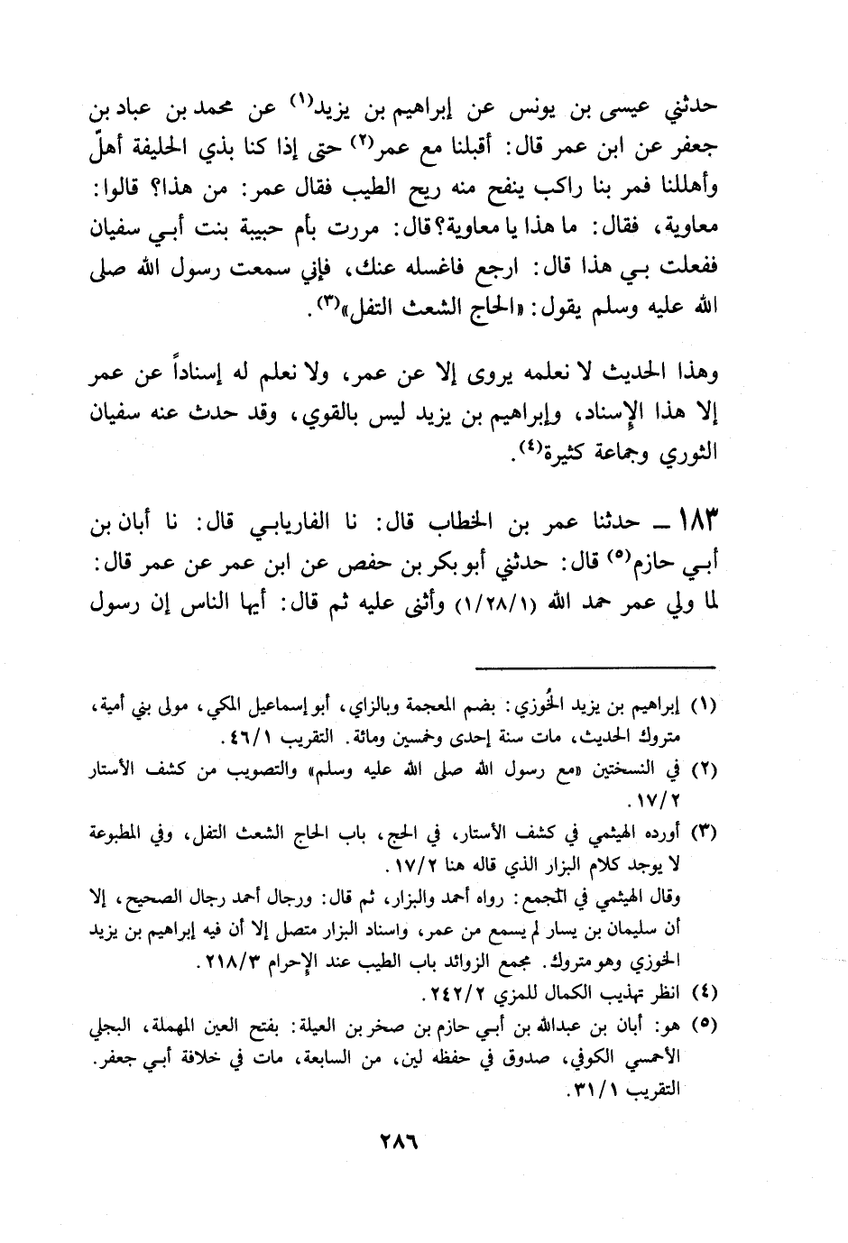 183 - حَدَّثَنَا عُمَرُ بْنُ الْخَطَّابِ قَالَ: نا الْفَارَيَابِيُّ قَالَ: نا أَبَانُ بْنُ أَبِي حَازِمٍ قَالَ: حَدَّثَنِي أَبُو بَكْرِ بْنُ حَفْصٍ، عَنِ ابْنِ عُمَرَ، عَنْ عُمَرَ قَالَ: لَمَّا وَلِيَ عُمَرُ حَمِدَ اللَّهَ وَأَثْنَى عَلَيْهِ ثُمَّ قَالَ: «أَيُّهَا النَّاسُ إِنَّ رَسُولَ -[287]- اللَّهِ صَلَّى اللهُ عَلَيْهِ وَسَلَّمَ §أَحَلَّ لَنَا الْمُتْعَةَ ثُمَّ حَرَّمَهَا عَلَيْنَا» وَهَذَا الْحَدِيثُ لَا نَعْلَمُ لَهُ إِسْنَادًا عَنْ عُمَرَ أَحْسَنَ مِنْ هَذَا الْإِسْنَادِ