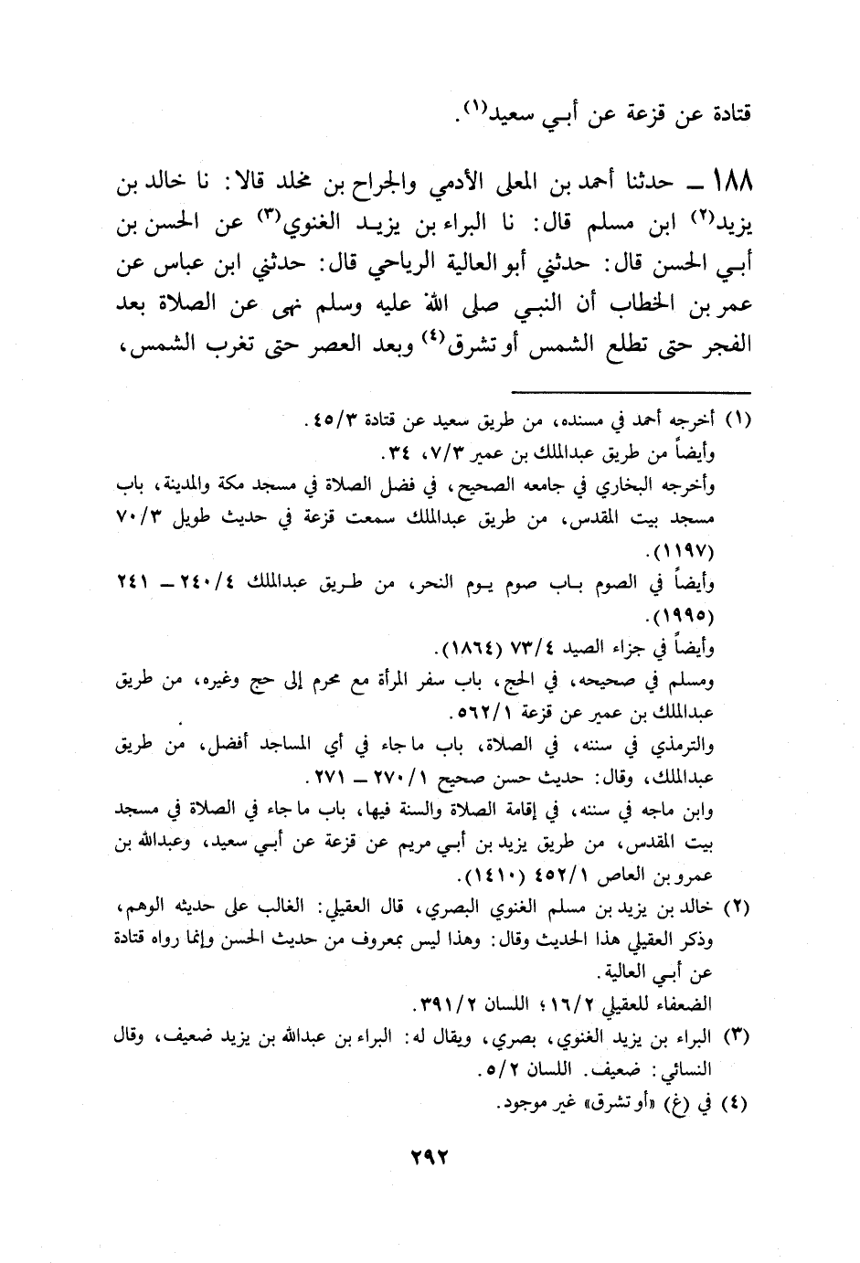 188 - حَدَّثَنَا أَحْمَدُ بْنُ الْمُعَلَّى الْأَدَمِيُّ، وَالْجَرَّاحُ بْنُ مَخْلَدٍ قَالَا: نا خَالِدُ بْنُ يَزِيدَ بْنِ مُسْلِمٍ، قَالَ: نا الْبَرَاءُ بْنُ يَزِيدَ الْغَنَوِيُّ، عَنِ الْحَسَنِ بْنِ أَبِي الْحَسَنِ قَالَ: حَدَّثَنِي أَبُو الْعَالِيَةِ الرِّيَاحِيُّ قَالَ: حَدَّثَنِي ابْنُ عَبَّاسٍ، عَنْ عُمَرَ بْنِ الْخَطَّابِ «أَنَّ النَّبِيَّ صَلَّى اللهُ عَلَيْهِ وَسَلَّمَ §نَهَى عَنِ الصَّلَاةِ بَعْدَ الْفَجْرِ حَتَّى تَطْلُعَ الشَّمْسُ أَوْ تُشْرِقَ، وَبَعْدَ الْعَصْرِ حَتَّى تَغْرُبَ الشَّمْسُ» -[293]-. وَقَالَ: «لَتَأْمُرُنَّ بِالْمَعْرُوفِ وَلَتَنْهَوُنَّ عَنِ الْمُنْكَرِ أَوْ لَيُسَلِّطَنَّ اللَّهُ عَلَيْكُمْ شِرَارَكُمْ فَيَدْعُو خِيَارُكُمْ فَلَا يُسْتَجَابُ لَهُمْ» وَهَذَا الْحَدِيثُ قَدْ رَوَى بَعْضَهُ قَتَادَةُ، عَنْ أَبِي الْعَالِيَةِ، عَنِ ابْنِ عَبَّاسٍ، عَنْ عُمَرَ، وَهُوَ أَنَّ النَّبِيَّ صَلَّى اللهُ عَلَيْهِ وَسَلَّمَ نَهَى عَنِ الصَّلَاةِ بَعْدَ الْفَجْرِ وَبَعْدَ الْعَصْرِ، وَأَمَّا لَتَأْمُرُنَّ بِالْمَعْرُوفِ وَلَتَنْهَوُنَّ عَنِ الْمُنْكَرِ، فَلَمْ يَرْوِهِ إِلَّا الْبَرَاءُ عَنِ الْحَسَنِ، عَنْ أَبِي الْعَالِيَةِ، عَنِ ابْنِ عَبَّاسٍ، عَنْ عُمَرَ، وَلَا نَعْلَمُ أَسْنَدَ الْحَسَنُ عَنْ أَبِي الْعَالِيَةِ حَدِيثًا إِلَّا هَذَا الْحَدِيثَ، وَلَمْ يَرْوِهِ عَنْهُ إِلَّا خَالِدُ بْنُ يَزِيدَ، وَلَمْ يَرْوِ أَبُو الْعَالِيَةِ عَنِ ابْنِ عَبَّاسٍ، عَنْ عُمَرَ إِلَّا هَذَا الْحَدِيثَ، وَالْبَرَاءُ بْنُ يَزِيدَ لَيْسَ بِالْقَوِيِّ، وَقَدِ احْتَمَلَ حَدِيثَهُ، وَرَوَى عَنْهُ جَمَاعَةٌ