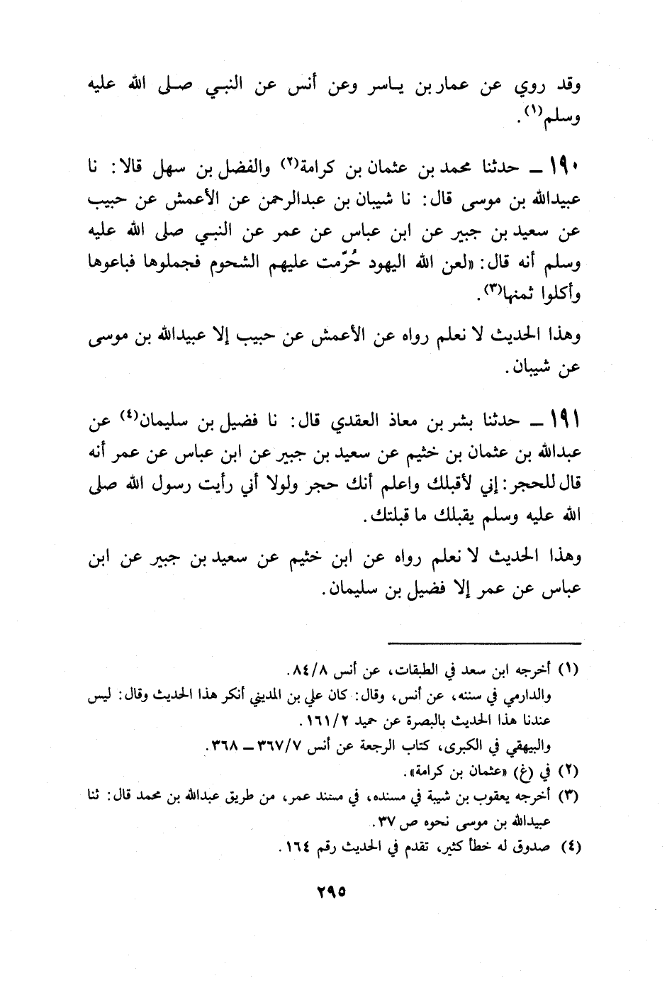 191 - حَدَّثَنَا بِشْرُ بْنُ مُعَاذٍ الْعَقَدِيُّ قَالَ: نا فُضَيْلُ بْنُ سُلَيْمَانَ، عَنْ عَبْدِ اللَّهِ بْنِ عُثْمَانَ بْنِ خُثَيْمٍ، عَنْ سَعِيدِ بْنِ جُبَيْرٍ، عَنِ ابْنِ عَبَّاسٍ، عَنْ عُمَرَ أَنَّهُ قَالَ لِلْحَجَرِ: «§إِنِّي لَأُقَبِّلُكَ وَأَعْلَمُ أَنَّكَ حَجَرٌ، وَلَوْلَا أَنِّي رَأَيْتُ رَسُولَ اللَّهِ صَلَّى اللهُ عَلَيْهِ وَسَلَّمَ يُقَبِّلُكَ مَا قَبَّلْتُكَ» وَهَذَا الْحَدِيثُ لَا نَعْلَمُ رَوَاهُ عَنِ ابْنِ خُثَيْمٍ، عَنْ سَعِيدِ بْنِ جُبَيْرٍ، عَنِ ابْنِ عَبَّاسٍ، عَنْ عُمَرَ إِلَّا فُضَيْلُ بْنُ سُلَيْمَانَ
