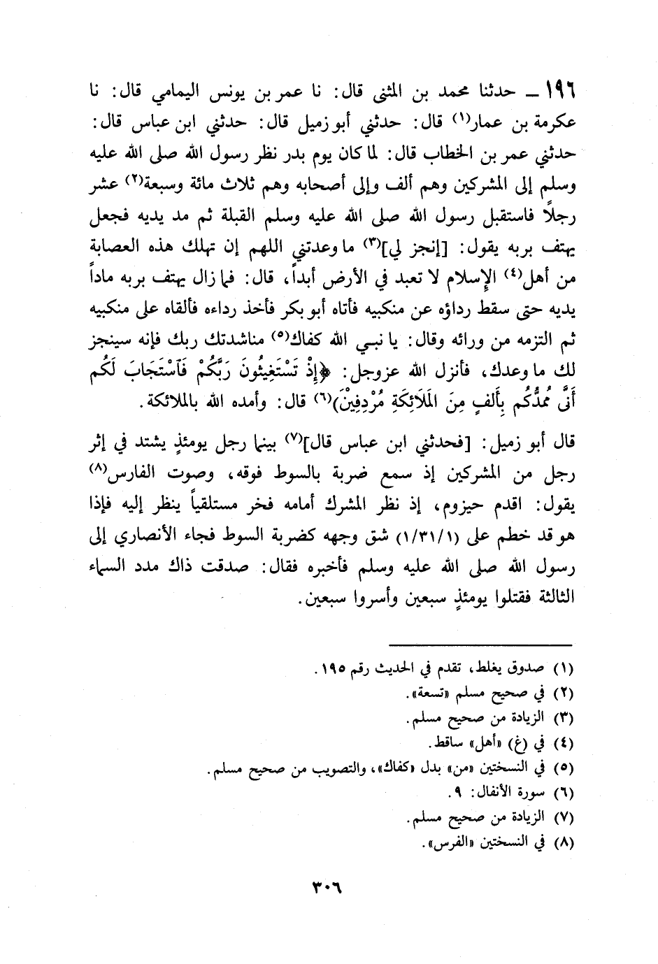 196 - حَدَّثَنَا مُحَمَّدُ بْنُ الْمُثَنَّى قَالَ: نا عُمَرُ بْنُ يُونُسَ الْيَمَامِيُّ قَالَ: نا عِكْرِمَةُ بْنُ عَمَّارٍ قَالَ: حَدَّثَنِي أَبُو زُمَيْلٍ قَالَ: حَدَّثَنِي ابْنُ عَبَّاسٍ قَالَ: حَدَّثَنِي عُمَرُ بْنُ الْخَطَّابِ قَالَ: لَمَّا كَانَ يَوْمُ بَدْرٍ نَظَرَ رَسُولُ اللَّهِ صَلَّى اللهُ عَلَيْهِ وَسَلَّمَ إِلَى الْمُشْرِكِينَ وَهُمْ أَلْفٌ، وَإِلَى أَصْحَابِهِ وَهُمْ ثَلَاثُ مِائَةٍ وَسَبْعَةَ عَشَرَ رَجُلًا فَاسْتَقْبَلَ رَسُولُ اللَّهِ صَلَّى اللهُ عَلَيْهِ وَسَلَّمَ الْقِبْلَةَ ثُمَّ مَدَّ يَدَيْهِ فَجَعَلَ يَهْتِفُ بِرَبِّهِ يَقُولُ: «§أَنْجِزْ لِي مَا وَعَدْتَنِي، اللَّهُمَّ إِنَّ تُهْلِكْ هَذِهِ الْعِصَابَةَ مِنْ أَهْلِ الْإِسْلَامِ لَا تَعْبُدُ فِي الْأَرْضِ أَبَدًا» ، قَالَ: فَمَا زَالَ يَهْتِفُ بِرَبِّهِ مَادًّا يَدَيْهِ حَتَّى سَقَطَ رِدَاؤُهُ عَنْ مَنْكِبَيْهِ، فَأَتَاهُ أَبُو بَكْرٍ فَأَخَذَ رِدَاءَهُ فَأَلْقَاهُ عَلَى مَنْكِبَيْهِ، ثُمَّ الْتَزَمَهُ مِنْ وَرَائِهِ وَقَالَ: يَا نَبِيَّ اللَّهِ كَفَاكَ مُنَاشَدَتُكَ رَبَّكَ فَإِنَّهُ سَيُنْجِزُ لَكَ مَا وَعَدَكَ، فَأَنْزَلَ اللَّهُ عَزَّ وَجَلَّ {إِذْ تَسْتَغِيثُونَ رَبَّكُمْ فَاسْتَجَابَ لَكُمْ أَنِّي مُمِدُّكُمْ بِأَلْفٍ مِنَ الْمَلَائِكَةِ مُرْدِفِينَ} [الأنفال: 9] قَالَ: وَأَمَدَّهُ اللَّهُ بِالْمَلَائِكَةِ " قَالَ أَبُو زُمَيْلٍ: فَحَدَّثَنِي ابْنُ عَبَّاسٍ قَالَ: بَيْنَمَا رَجُلٌ يَوْمَئِذٍ يَشْتَدُّ فِي إِثْرِ رَجُلٍ مِنَ الْمُشْرِكِينَ إِذْ سَمِعَ ضَرْبَةً بِالسَّوْطِ فَوْقَهُ، وَصَوْتُ الْفَارِسِ يَقُولُ: قَادِمٌ حَيْزُومُ إِذْ نَظَرَ الْمُشْرِكُ أَمَامَهُ فَخَرَّ مُسْتَلْقِيًا يَنْظُرُ إِلَيْهِ فَإِذَا هُوَ قَدْ خُطِمَ عَلَى شِقِّ وَجْهِهِ كَضَرْبَةِ السَّوْطِ، فَجَاءَ الْأَنْصَارِيُّ إِلَى رَسُولِ اللَّهِ صَلَّى اللهُ عَلَيْهِ وَسَلَّمَ فَأَخْبَرَهُ فَقَالَ: «صَدَقْتَ، ذَاكَ مَدَدُ السَّمَاءِ الثَّالِثَةِ» . فَقَتَلُوا يَوْمَئِذٍ سَبْعِينَ وَأَسَرُوا سَبْعِينَ -[307]-، قَالَ أَبُو زُمَيْلٍ: قَالَ ابْنُ عَبَّاسٍ: لَمَّا أَسَرُوا الْأُسَارَى قَالَ رَسُولُ اللَّهِ صَلَّى اللهُ عَلَيْهِ وَسَلَّمَ: «يَا أَبَا بَكْرٍ وَيَا عُمَرُ مَا تَرَوْنَ فِي هَؤُلَاءِ الْأُسَارَى؟» قَالَ أَبُو بَكْرٍ: هُمْ بَنُو الْعَمِّ وَالْعَشِيرَةِ، نَرَى أَنْ تَأْخُذَ أَوْ نَأْخُذَ مِنْهُمْ فِدْيَةً فَيَكُونَ لَنَا قُوَّةً عَلَى الْكُفَّارِ، فَقَالَ رَسُولُ اللَّهِ صَلَّى اللهُ عَلَيْهِ وَسَلَّمَ: «يَا عُمَرُ مَا تَرَى؟» قَالَ: قُلْتُ: لَا وَاللَّهِ مَا أَرَى الَّذِي قَالَ أَبُو بَكْرٍ، يَا نَبِيَّ اللَّهِ أَرَى أَنْ تُمَكِّنَّا مِنْهُمْ فَنَضْرِبَ أَعْنَاقَهُمْ وَتُمَكِّنَ عَلِيًّا مِنْ عَقِيلٍ فَيَضْرِبَ عُنُقَهُ وَتُمَكِّنِّي مِنْ فُلَانٍ نَسِيبًا لِعُمَرَ فَأَضْرِبَ عُنُقَهُ، فَإِنَّ هَؤُلَاءِ أَئِمَّةُ الْكُفْرِ وَصَنَادِيدُهُمْ، قَالَ: فَهَوَى رَسُولُ اللَّهِ صَلَّى اللهُ عَلَيْهِ وَسَلَّمَ مَا قَالَ أَبُو بَكْرٍ، وَلَمْ يَهْوَ مَا قُلْتُ، فَلَمَّا كَانَ مِنَ الْغَدِ جِئْتُ إِلَى رَسُولِ اللَّهِ صَلَّى اللهُ عَلَيْهِ وَسَلَّمَ وَهُوَ وَأَبُو بَكْرٍ قَاعِدَانِ يَبْكِيَانِ فَقُلْتُ: يَا رَسُولَ اللَّهِ أَخْبِرْنِي مِنْ أَيِّ شَيْءٍ تَبْكِي أَنْتَ وَصَاحِبُكَ، فَإِنْ وَجَدْتُ بُكَاءً بَكَيْتُ، وَإِنْ لَمْ أَجِدْ بُكَاءً تَبَاكَيْتُ لِبُكَائِكُمَا؟ فَقَالَ: " أَبْكِي لِلَّذِي عَرَضَ عَلَى أَصْحَابِكَ مِنْ أَخَذِهِمُ الْفِدَاءَ، لَقَدْ عُرِضَ عَلَيَّ عَذَابُكُمْ أَدْنَى مِنْ هَذِهِ الشَّجَرَةِ لِشَجَرَةٍ قَرِيبَةٍ مِنْ نَبِيِّ اللَّهِ صَلَّى اللهُ عَلَيْهِ وَسَلَّمَ، فَأَنْزَلَ اللَّهُ عَزَّ وَجَلَّ {مَ