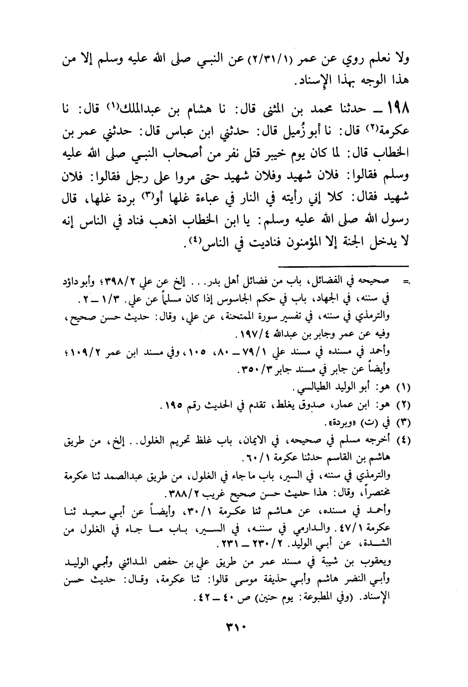 198 - حَدَّثَنَا مُحَمَّدُ بْنُ الْمُثَنَّى قَالَ: نا هِشَامُ بْنُ عَبْدِ الْمَلِكِ قَالَ: نا عِكْرِمَةُ قَالَ: نا أَبُو زُمَيْلٍ قَالَ: حَدَّثَنِي ابْنُ عَبَّاسٍ قَالَ: حَدَّثَنِي عُمَرُ بْنُ الْخَطَّابِ قَالَ: لَمَّا كَانَ يَوْمُ خَيْبَرَ قُتِلَ نَفَرٌ مِنْ أَصْحَابِ النَّبِيِّ صَلَّى اللهُ عَلَيْهِ وَسَلَّمَ فَقَالُوا: فُلَانٌ شَهِيدٌ وَفُلَانٌ شَهِيدٌ، حَتَّى مَرُّوا عَلَى رَجُلٍ فَقَالُوا: فُلَانٌ شَهِيدٌ، فَقَالَ: كَلَّا إِنِّي رَأَيْتُهُ فِي النَّارِ فِي عَبَاءَةٍ غَلَّهَا أَوْ بُرْدَةٍ غَلَّهَا قَالَ رَسُولُ اللَّهِ صَلَّى اللهُ عَلَيْهِ وَسَلَّمَ: «يَا ابْنَ الْخَطَّابِ اذْهَبْ فَنَادِ فِي النَّاسِ إِنَّهُ §لَا يَدْخُلُ الْجَنَّةَ إِلَّا الْمُؤْمِنُونَ فَنَادَيْتُ فِي النَّاسِ» -[311]-. وَهَذَا الْحَدِيثُ لَا نَعْلَمُهُ يُرْوَى عَنْ عُمَرَ، عَنِ النَّبِيِّ صَلَّى اللهُ عَلَيْهِ وَسَلَّمَ إِلَّا مِنْ هَذَا الْوَجْهِ