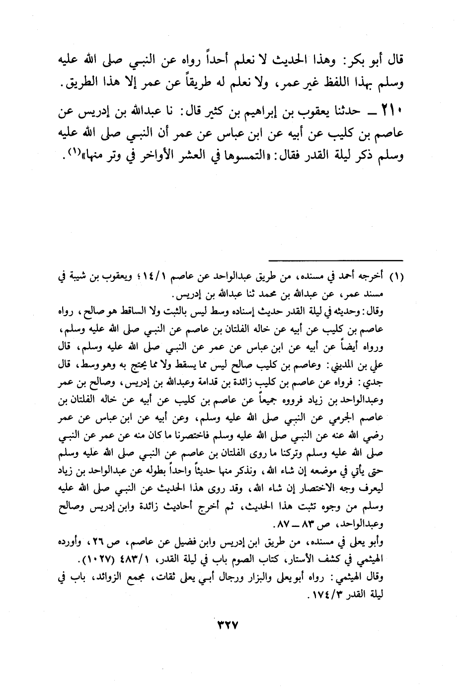 210 - حَدَّثَنَا يَعْقُوبُ بْنُ إِبْرَاهِيمَ بْنِ كَثِيرٍ قَالَ: نَا عَبْدُ اللَّهِ بْنُ إِدْرِيسَ، عَنْ عَاصِمِ بْنِ كُلَيْبٍ، عَنْ أَبِيهِ، عَنِ ابْنِ عَبَّاسٍ، عَنْ عُمَرَ أَنَّ النَّبِيَّ صَلَّى اللهُ عَلَيْهِ وَسَلَّمَ ذَكَرَ لَيْلَةَ الْقَدْرِ فَقَالَ: «§الْتَمِسُوهَا فِي الْعَشْرِ الْأَوَاخِرِ فِي وِتْرٍ مِنْهَا»