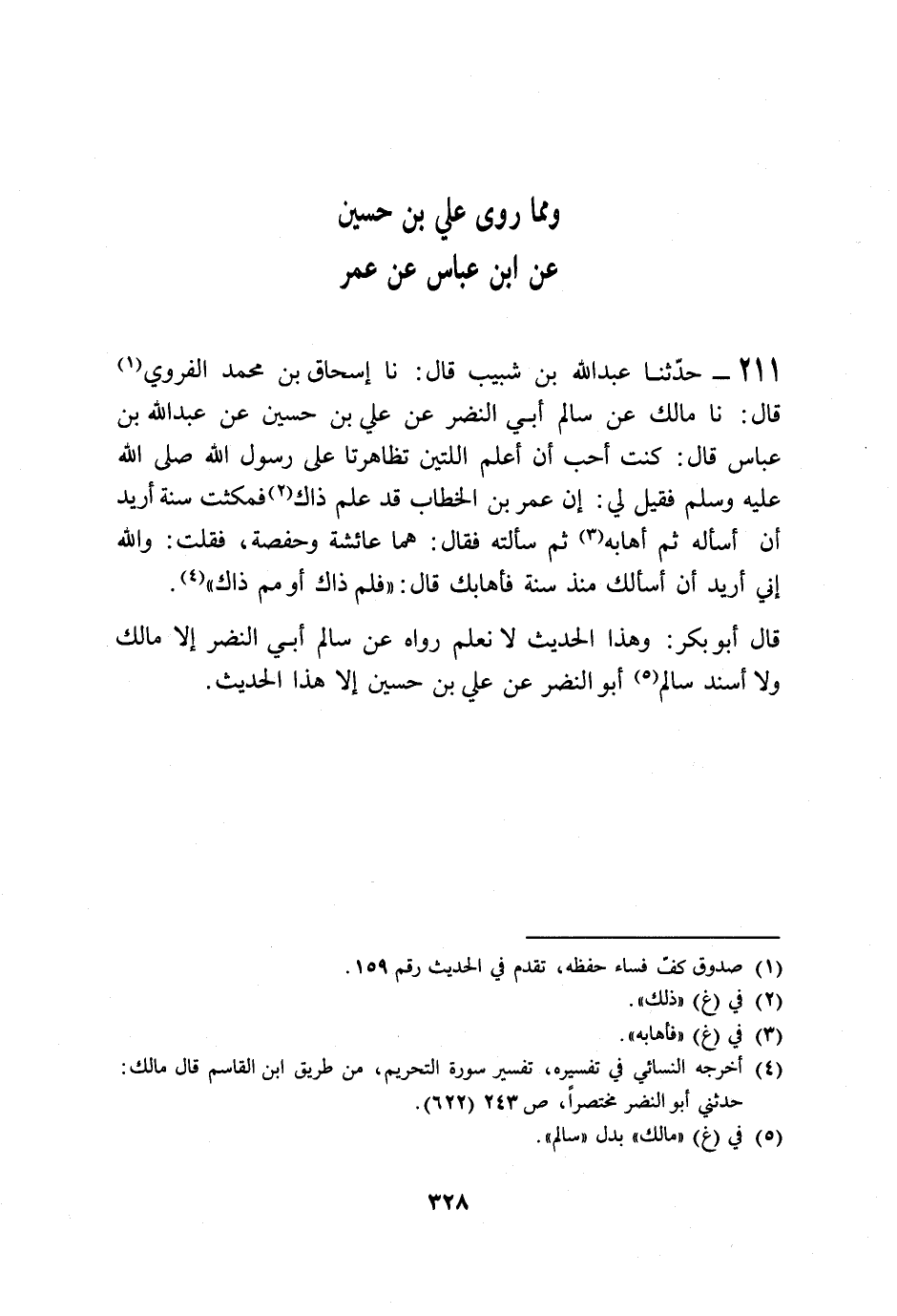211 - حَدَّثَنَا عَبْدُ اللَّهِ بْنُ شَبِيبٍ قَالَ: نا إِسْحَاقُ بْنُ مُحَمَّدٍ الْفَرْوِيُّ قَالَ: نا مَالِكٌ، عَنْ سَالِمٍ أَبِي النَّضْرِ، عَنْ عَلِيِّ بْنِ حُسَيْنٍ، عَنْ عَبْدِ اللَّهِ بْنِ عَبَّاسٍ قَالَ: كُنْتُ §أُحِبُّ أَنْ أَعْلَمَ اللَّتَيْنِ تَظَاهَرَتَا عَلَى رَسُولِ اللَّهِ صَلَّى اللهُ عَلَيْهِ وَسَلَّمَ؟ فَقِيلَ لِي: إِنَّ عُمَرَ بْنَ الْخَطَّابِ قَدْ عَلِمَ ذَاكَ فَمَكَثْتُ سَنَةً أُرِيدُ أَنْ أَسْأَلَهُ ثُمَّ أَهَابُهُ، ثُمَّ سَأَلْتُهُ فَقَالَ: هُمَا عَائِشَةُ وَحَفْصَةُ، فَقُلْتُ: وَاللَّهِ إِنِّي أُرِيدُ أَنْ أَسْأَلَكَ مُنْذُ سَنَةٍ فَأَهَابُكَ، قَالَ: فَلِمَ ذَاكَ؟ أَوْ مِمَّ ذَاكَ؟ " قَالَ أَبُو بَكْرٍ: وَهَذَا الْحَدِيثُ لَا نَعْلَمُ رَوَاهُ عَنْ سَالِمٍ أَبِي النَّضْرِ إِلَّا مَالِكٌ وَلَا أَسْنَدَ سَالِمٌ أَبُو النَّضْرِ، عَنْ عَلِيِّ بْنِ حُسَيْنٍ إِلَّا هَذَا الْحَدِيثَ