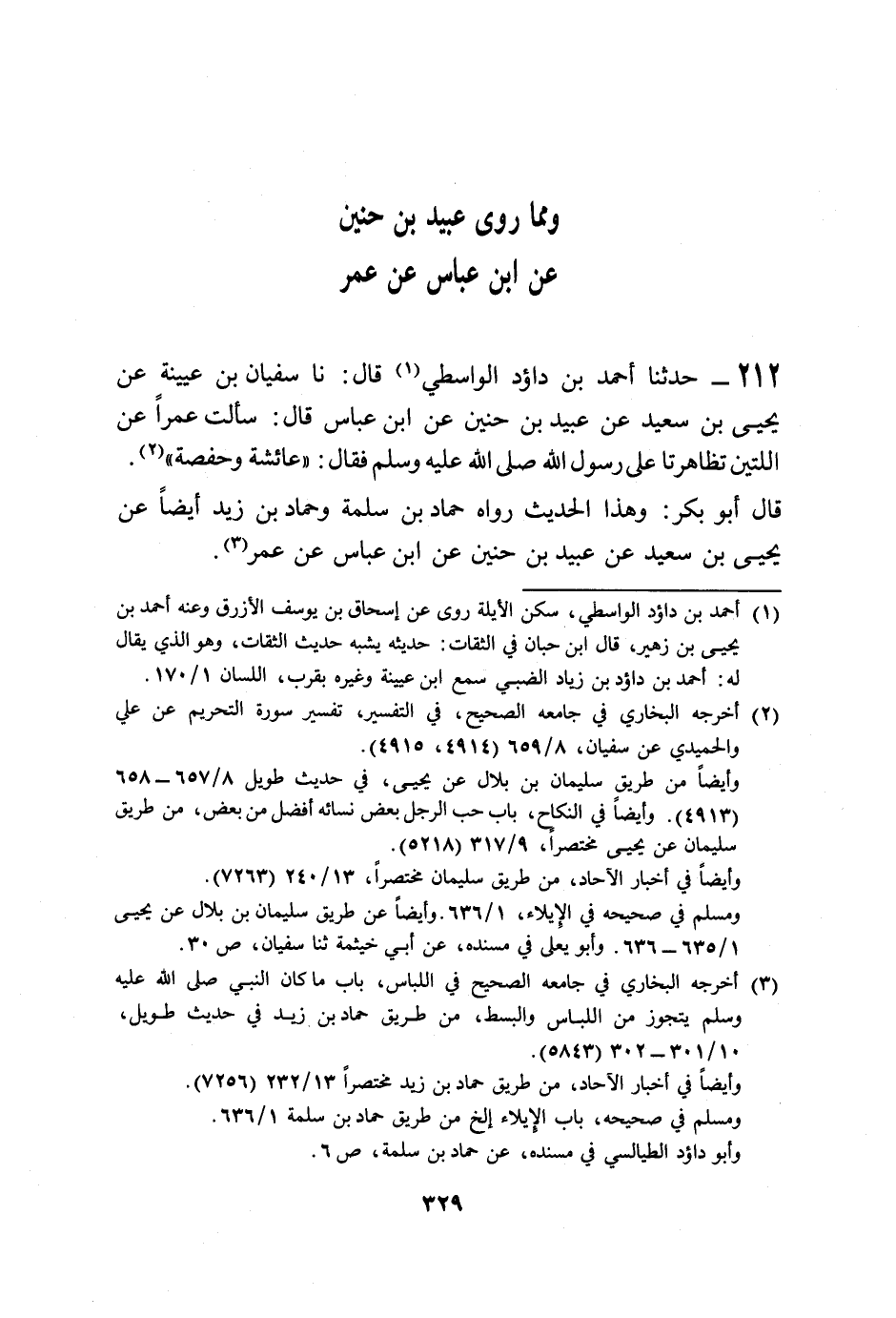 212 - حَدَّثَنَا أَحْمَدُ بْنُ دَاؤُدَ الْوَاسِطِيُّ قَالَ: نا سُفْيَانُ بْنُ عُيَيْنَةَ، عَنْ يَحْيَى بْنِ سَعِيدٍ، عَنْ عُبَيْدِ بْنِ حُنَيْنٍ، عَنِ ابْنِ عَبَّاسٍ قَالَ: سَأَلْتُ عُمَرَ عَنِ §اللَّتَيْنِ تَظَاهَرَتَا عَلَى رَسُولِ اللَّهِ صَلَّى اللهُ عَلَيْهِ وَسَلَّمَ فَقَالَ: عَائِشَةُ وَحَفْصَةُ " قَالَ أَبُو بَكْرٍ: وَهَذَا الْحَدِيثُ رَوَاهُ حَمَّادُ بْنُ سَلَمَةَ وَحَمَّادُ بْنُ زَيْدٍ أَيْضًا عَنْ يَحْيَى بْنِ سَعِيدٍ، عَنْ عُبَيْدِ بْنِ حُنَيْنٍ، عَنِ ابْنِ عَبَّاسٍ، عَنْ عُمَرَ