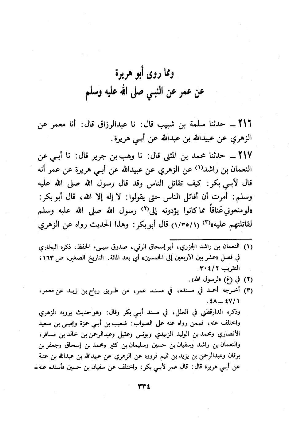 217 - وَحَدَّثَنَا مُحَمَّدُ بْنُ الْمُثَنَّى قَالَ: نا وَهْبُ بْنُ جَرِيرٍ قَالَ: نا أَبِي، عَنِ النُّعْمَانِ بْنِ رَاشِدٍ، عَنِ الزُّهْرِيِّ، عَنْ عُبَيْدِ اللَّهِ، عَنْ أَبِي هُرَيْرَةَ، عَنْ عُمَرَ أَنَّهُ قَالَ لِأَبِي بَكْرٍ: كَيْفَ تُقَاتِلُ النَّاسَ وَقَدْ قَالَ رَسُولُ اللَّهِ صَلَّى اللهُ عَلَيْهِ وَسَلَّمَ: «§أُمِرْتُ أَنْ أُقَاتِلَ النَّاسَ حَتَّى يَقُولُوا لَا إِلَهَ إِلَّا اللَّهُ» قَالَ أَبُو بَكْرٍ: لَوْ مَنَعُونِي عَنَاقًا مِمَّا كَانُوا يُؤَدُّونَهُ إِلَى رَسُولِ اللَّهِ صَلَّى اللهُ عَلَيْهِ وَسَلَّمَ لَقَاتَلْتُهُمْ عَلَيْهِ قَالَ أَبُو بَكْرٍ: وَهَذَا الْحَدِيثُ رَوَاهُ عَنِ الزُّهْرِيِّ -[335]-، عَنْ عُبَيْدِ اللَّهِ، عَنْ أَبِي هُرَيْرَةَ، مَعْمَرٌ، وَالنُّعْمَانُ، وَمُحَمَّدُ بْنُ إِسْحَاقَ، وَإِبْرَاهِيمُ بْنُ سَعْدٍ، وَغَيْرُهُمْ فَاجْتَزَينَا بِمَعْمَرٍ -[336]- وَقَالَ صَالِحُ بْنُ أَبِي الْأَخْضَرِ، عَنِ الزُّهْرِيِّ، عَنْ سَعِيدٍ، وَأَبِي سَلَمَةَ، عَنْ أَبِي هُرَيْرَةَ، عَنْ عُمَرَ، عَنِ النَّبِيِّ صَلَّى اللهُ عَلَيْهِ وَسَلَّمَ. وَقَدْ رُوِيَ فِي هَذَا الْبَابِ عَنِ النَّبِيِّ صَلَّى اللهُ عَلَيْهِ وَسَلَّمَ أَحَادِيثُ عَنْ أَبِي هُرَيْرَةَ، وَابْنِ عُمَرَ وَجَابِرٍ وَأَنَسٍ وَغَيْرِهِمْ فِي: لَوْ مَنَعُونِي عَنَاقًا أَوْ عِقَالًا