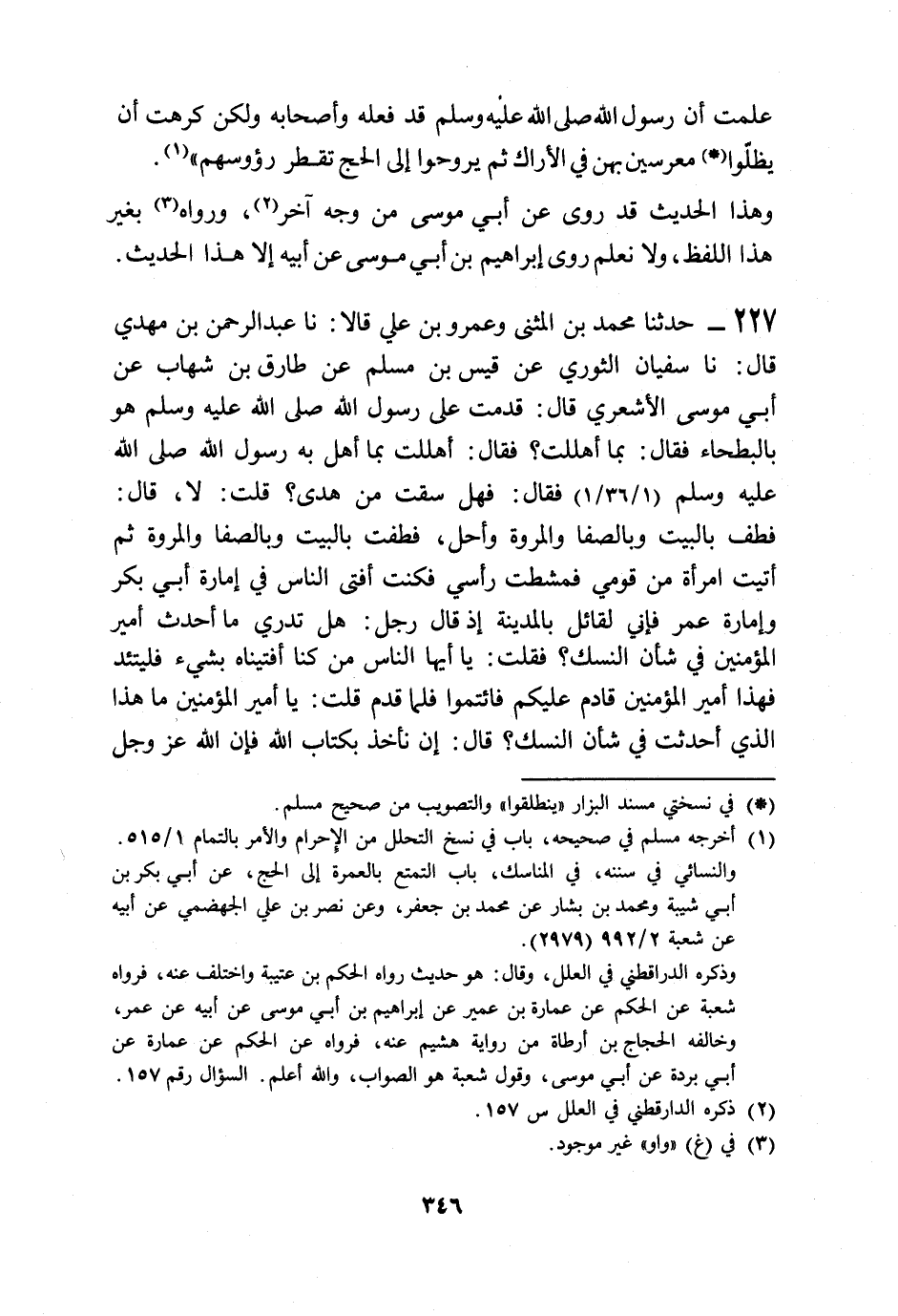 227 - حَدَّثَنَا مُحَمَّدُ بْنُ الْمُثَنَّى، وَعَمْرُو بْنُ عَلِيٍّ قَالَا: نا عَبْدُ الرَّحْمَنِ بْنُ مَهْدِيٍّ قَالَ: نا سُفْيَانُ الثَّوْرِيُّ، عَنْ قَيْسِ بْنِ مُسْلِمٍ، عَنْ طَارِقِ بْنِ شِهَابٍ، عَنْ أَبِي مُوسَى الْأَشْعَرِيِّ قَالَ: قَدِمْتُ عَلَى رَسُولِ اللَّهِ صَلَّى اللهُ عَلَيْهِ وَسَلَّمَ وَهُوَ بِالْبَطْحَاءِ فَقَالَ: " §بِمَا أَهْلَلْتَ؟ فَقَالَ: أَهْلَلْتُ بِمَا أَهَلَّ بِهِ رَسُولُ اللَّهِ صَلَّى اللهُ عَلَيْهِ وَسَلَّمَ فَقَالَ: " هَلْ سُقْتَ مِنْ هَدْيٍ؟ قُلْتُ: لَا، قَالَ: «فَطُفْ بِالْبَيْتِ وَبِالصَّفَا وَالْمَرْوَةِ وَأَحِلَّ» . فَطُفْتُ بِالْبَيْتِ وَبِالصَّفَا وَالْمَرْوَةِ ثُمَّ أَتَيْتُ امْرَأَةً مِنْ قَوْمِي فَمَشَطَتْ رَأْسِي، فَكُنْتُ أُفْتِي النَّاسَ فِي إِمَارَةِ أَبِي بَكْرٍ وَإِمَارَةِ عُمَرَ، فَإِنِّي لَقَائِلٌ بِالْمَدِينَةِ إِذْ قَالَ رَجُلٌ هَلْ تَدْرِي مَا أَحْدَثَ أَمِيرُ الْمُؤْمِنِينَ فِي شَأْنِ النُّسُكِ؟ فَقُلْتُ: يَا أَيُّهَا النَّاسُ مَنْ كُنَّا أَفْتَيْنَاهُ بِشَيْءٍ فَلْيَتَّئِدْ فَهَذَا أَمِيرُ الْمُؤْمِنِينَ قَادِمٌ عَلَيْكُمْ فَائْتَمُّوا، فَلَمَّا قَدِمَ قُلْتُ: يَا أَمِيرَ الْمُؤْمِنِينَ مَا هَذَا الَّذِي أَحْدَثْتَ فِي شَأْنِ النُّسُكِ؟ قَالَ: إِنْ نَأْخُذْ بِكِتَابِ اللَّهِ فَإِنَّ اللَّهَ عَزَّ وَجَلَّ -[347]- قَالَ {وَأَتِمُّوا الْحَجَّ وَالْعُمْرَةَ لِلَّهِ} [البقرة: 196] ، وَأَنْ نَأْخُذَ بِسُنَّةِ نَبِيِّنَا فَإِنَّ رَسُولَ اللَّهِ صَلَّى اللهُ عَلَيْهِ وَسَلَّمَ لَمْ يَحِلَّ حَتَّى نَحَرَ الْهَدْيَ