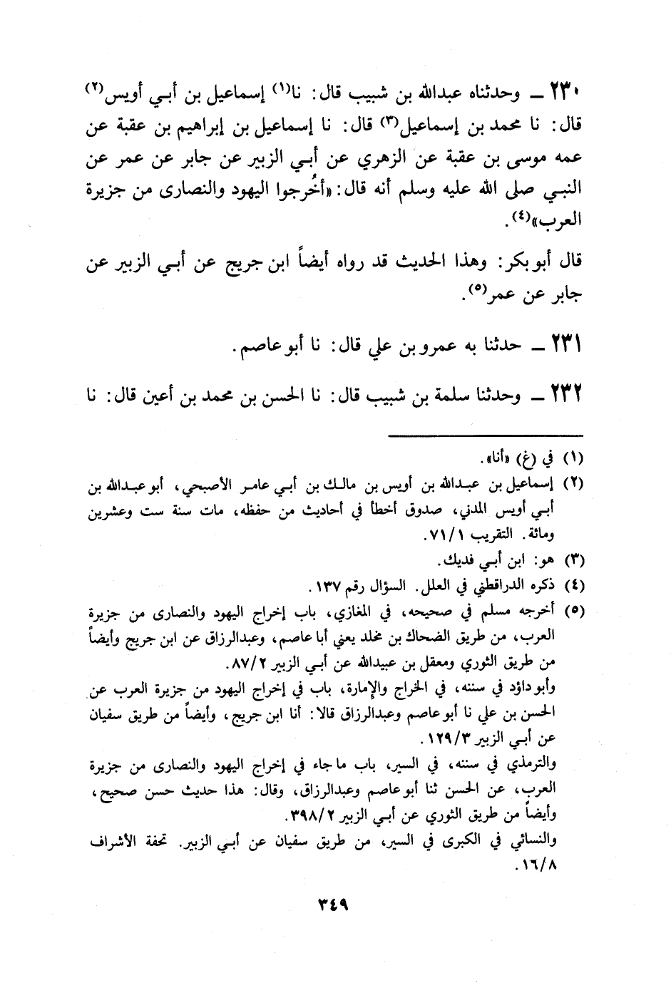 230 - وَحَدَّثَنَاهُ عَبْدُ اللَّهِ بْنُ شَبِيبٍ قَالَ: نا إِسْمَاعِيلُ بْنُ أَبِي أُوَيْسٍ قَالَ: نا مُحَمَّدُ بْنُ إِسْمَاعِيلَ قَالَ: نا إِسْمَاعِيلُ بْنُ إِبْرَاهِيمَ بْنِ عُقْبَةَ، عَنْ عَمِّهِ مُوسَى بْنِ عُقْبَةَ، عَنِ الزُّهْرِيِّ، عَنْ أَبِي الزُّبَيْرِ، عَنْ جَابِرٍ، عَنْ عُمَرَ، عَنِ النَّبِيِّ صَلَّى اللهُ عَلَيْهِ وَسَلَّمَ أَنَّهُ قَالَ: «§أَخْرِجُوا الْيَهُودَ وَالنَّصَارَى مِنْ جَزِيرَةِ الْعَرَبِ» قَالَ أَبُو بَكْرٍ: وَهَذَا الْحَدِيثُ قَدْ رَوَاهُ أَيْضًا ابْنُ جُرَيْجٍ، عَنْ أَبِي الزُّبَيْرِ، عَنْ جَابِرٍ، عَنْ عُمَرَ