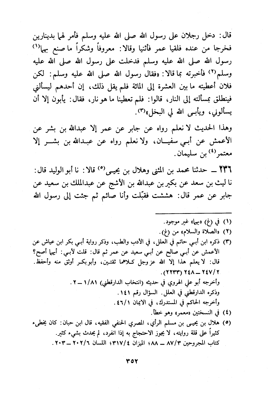 236 - حَدَّثَنَا مُحَمَّدُ بْنُ الْمُثَنَّى، وَهِلَالُ بْنُ يَحْيَى قَالَا: نا أَبُو الْوَلِيدِ قَالَ: نا لَيْثُ بْنُ سَعْدٍ، عَنْ بُكَيْرِ بْنِ عَبْدِ اللَّهِ بْنِ الْأَشَجِّ، عَنْ عَبْدِ الْمَلِكِ بْنِ سَعِيدٍ، عَنْ جَابِرٍ، عَنْ عُمَرَ قَالَ: هَشَشْتُ فَقَبَّلْتُ وَأَنَا صَائِمٌ، ثُمَّ جِئْتُ إِلَى رَسُولِ اللَّهِ صَلَّى اللهُ عَلَيْهِ وَسَلَّمَ -[353]- فَقُلْتُ: لَقَدْ فَعَلْتُ الْيَوْمَ أَمْرًا عَظِيمًا، قَالَ: " مَا هُوَ؟ قُلْتُ: §هَشَشْتُ فَقَبَّلْتُ وَأَنَا صَائِمٌ، قَالَ: " أَرَأَيْتَ لَوْ مَضْمَضْتَ مِنَ الْمَاءِ؟ قُلْتُ: إِذَنْ لَا يَضُرُّ، قَالَ: «فَفِيمَ» وَهَذَا الْحَدِيثُ لَا نَعْلَمُهُ يُرْوَى إِلَّا عَنْ عُمَرَ مِنْ هَذَا الْوَجْهِ
