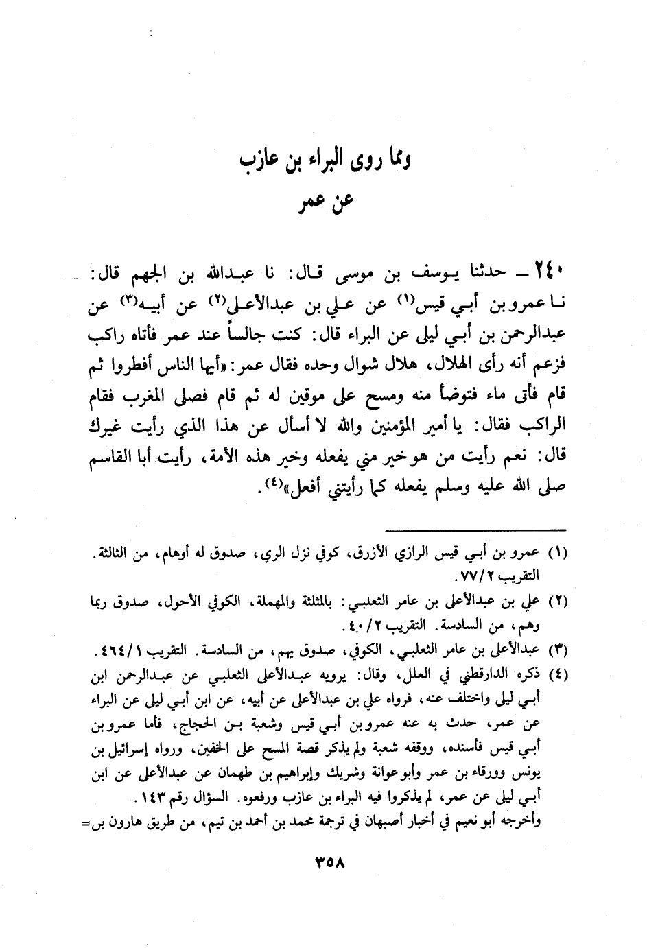 240 - حَدَّثَنَا يُوسُفُ بْنُ مُوسَى قَالَ: نا عَبْدُ اللَّهِ بْنُ الْجَهْمِ قَالَ: نا عَمْرُو بْنُ أَبِي قَيْسٍ، عَنْ عَلِيِّ بْنِ عَبْدِ الْأَعْلَى، عَنْ أَبِيهِ، عَنْ عَبْدِ الرَّحْمِنِ بْنِ أَبِي لَيْلَى، عَنِ الْبَرَاءِ قَالَ: كُنْتُ جَالِسًا عِنْدَ عُمَرَ فَأَتَاهُ رَاكِبٌ فَزَعَمَ أَنَّهُ رَأَى الْهِلَالَ هِلَالَ شَوَّالٍ وَحْدَهُ، فَقَالَ عُمَرُ: " §أَيُّهَا النَّاسُ أَفْطِرُوا، ثُمَّ قَامَ فَأَتَى مَاءً فَتَوَضَّأَ مِنْهُ وَمَسَحَ عَلَى مُوقَيْنِ لَهُ، ثُمَّ قَامَ فَصَلَّى الْمَغْرِبَ فَقَامَ الرَّاكِبُ فَقَالَ: يَا أَمِيرَ الْمُؤْمِنِينَ وَاللَّهِ لَا أَسْأَلُ عَنْ هَذَا الَّذِي رَأَيْتُ غَيْرَكَ، قَالَ: نَعَمْ رَأَيْتُ مَنَ هُوَ خَيْرٌ مِنِّي يَفْعَلُهُ، وَخَيْرُ هَذِهِ الْأُمَّةِ رَأَيْتُ أَبَا الْقَاسِمِ صَلَّى اللهُ عَلَيْهِ وَسَلَّمَ يَفْعَلُهُ كَمَا رَأَيْتَنِي أَفْعَلُ " -[359]- وَهَذَا الْحَدِيثُ لَا نَعْلَمُهُ يُرْوَى بِهَذَا اللَّفْظِ عَنْ عُمَرَ إِلَّا مِنْ هَذَا الْوَجْهِ، وَقَدْ رَوَى هَذَا الْحَدِيثَ غَيْرُ وَاحِدٍ، عَنْ عَبْدِ الْأَعْلَى، عَنْ عَبْدِ الرَّحْمَنِ بْنِ أَبِي لَيْلَى، عَنْ عُمَرَ، وَلَمْ يَذْكُرِ الْبَرَاءَ، وَبَعْضُهُمْ لَمْ يُسْنِدْهُ عَنْ عُمَرَ
