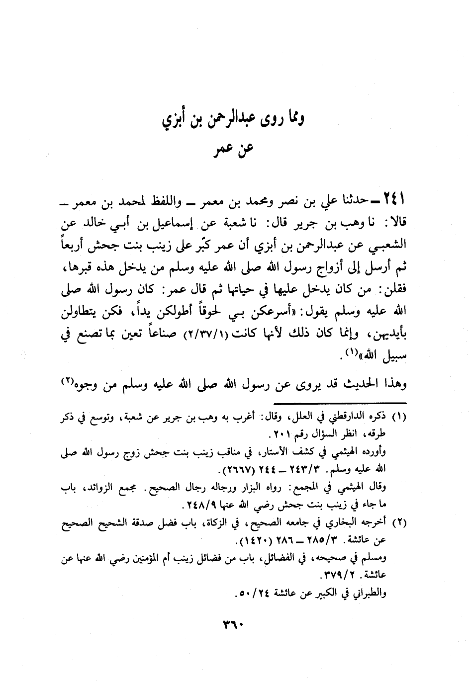 241 - حَدَّثَنَا عَلِيُّ بْنُ نَصْرٍ، وَمُحَمَّدُ بْنُ مَعْمَرٍ وَاللَّفْظُ لِمُحَمَّدِ بْنِ مَعْمَرٍ قَالَا: نا وَهْبُ بْنُ جَرِيرٍ قَالَ: نا شُعْبَةُ، عَنْ إِسْمَاعِيلَ بْنِ أَبِي خَالِدٍ، عَنِ الشَّعْبِيِّ، عَنْ عَبْدِ الرَّحْمَنِ بْنِ أَبْزَى: أَنَّ عُمَرَ كَبَّرَ عَلَى زَيْنَبَ بِنْتِ جَحْشٍ أَرْبَعًا، ثُمَّ أَرْسَلَ إِلَى أَزْوَاجِ رَسُولِ اللَّهِ صَلَّى اللهُ عَلَيْهِ وَسَلَّمَ مَنْ يُدْخِلُ هَذِهِ قَبْرَهَا؟ فَقُلْنَ: مَنْ كَانَ يَدْخُلُ عَلَيْهَا فِي حَيَاتِهَا، ثُمَّ قَالَ عُمَرُ: كَانَ رَسُولُ اللَّهِ صَلَّى اللهُ عَلَيْهِ وَسَلَّمَ يَقُولُ: «§أَسْرَعُكُنَّ بِي لُحُوقًا أَطْوَلُكُنَّ يَدًا» فَكُنَّ يَتَطَاوَلْنَ بِأَيْدِيهِنَّ، وَإِنَّمَا كَانَ ذَلِكَ لِأَنَّهَا كَانَتْ صَنَاعًا تُعِينُ بِمَا تَصْنَعُ فِي سَبِيلِ اللَّهِ " وَهَذَا الْحَدِيثُ قَدْ يُرْوَى عَنْ رَسُولِ اللَّهِ صَلَّى اللهُ عَلَيْهِ وَسَلَّمَ مِنْ وُجُوهٍ -[361]-، وَلَا نَعْلَمُ رَوَاهُ أَحَدٌ عَنْ رَسُولِ اللَّهِ صَلَّى اللهُ عَلَيْهِ وَسَلَّمَ أَجَلُّ مِنْ عُمَرَ، وَقَدْ رَوَاهُ غَيْرُ وَاحِدٍ عَنْ إِسْمَاعِيلَ، عَنِ الشَّعْبِيِّ مُرْسَلًا، وَأَسْنَدَهُ شُعْبَةُ فَقَالَ: عَنِ ابْنِ أَبِي لَيْلَى، وَلَا نَعْلَمُ حَدَّثَ بِهِ، عَنْ شُعْبَةَ، إِلَّا وَهْبٌ