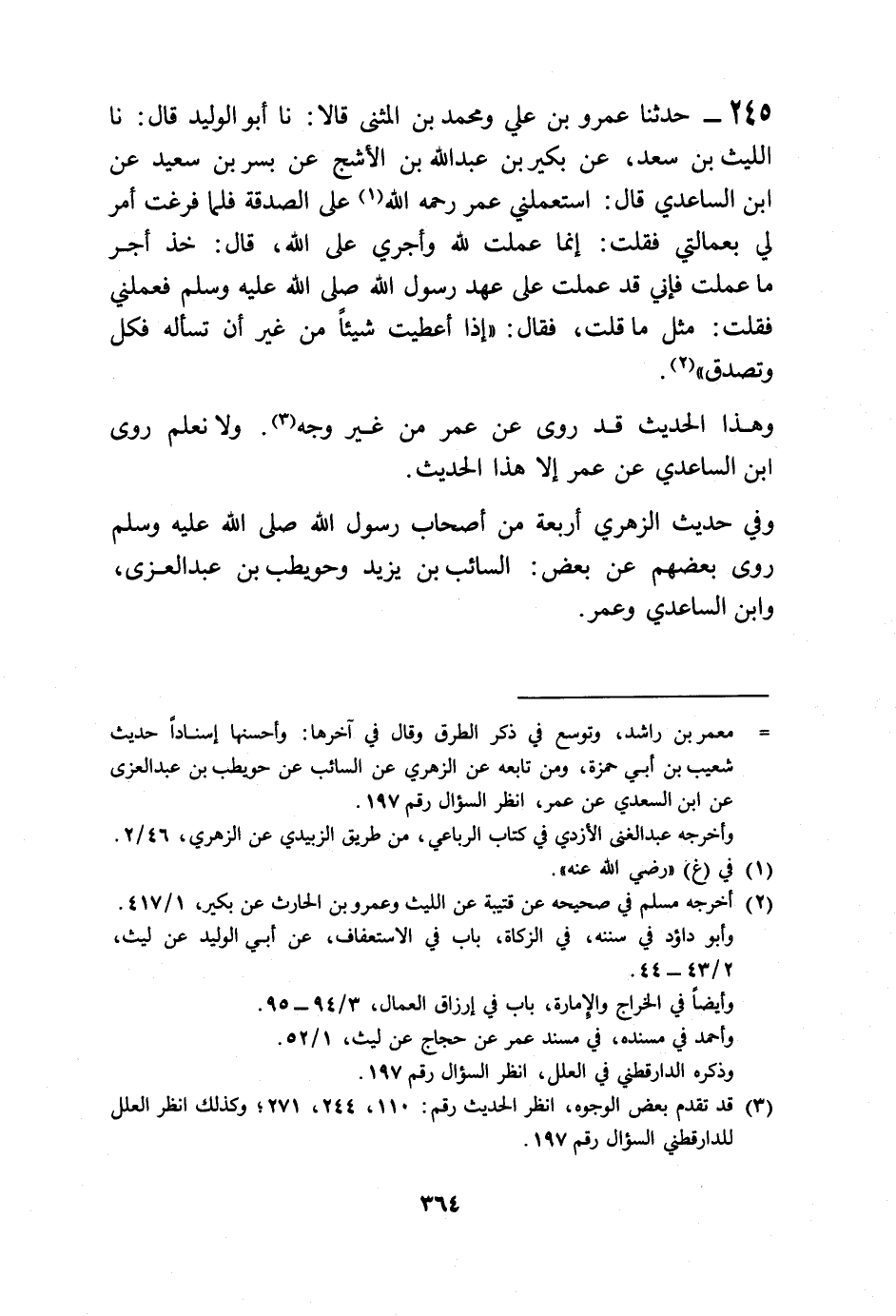 245 - حَدَّثَنَا عَمْرُو بْنُ عَلِيٍّ، وَمُحَمَّدُ بْنُ الْمُثَنَّى قَالَا: نا أَبُو الْوَلِيدِ قَالَ: نا اللَّيْثُ بْنُ سَعْدٍ، عَنْ بُكَيْرِ بْنِ عَبْدِ اللَّهِ بْنِ الْأَشَجِّ، عَنْ بُسْرِ بْنِ سَعِيدٍ، عَنِ ابْنِ السَّاعِدِيِّ قَالَ: اسْتَعْمَلَنِي عُمَرُ رَحِمَهُ اللَّهُ عَلَى الصَّدَقَةِ فَلَمَّا فَرَغْتُ أَمَرَ لِي بِعُمَالَتِي، فَقُلْتُ: إِنَّمَا عَمِلْتُ لِلَّهِ وَأَجْرِي عَلَى اللَّهِ، قَالَ: خُذْ أَجْرَ مَا عَمِلْتَ، فَإِنِّي قَدْ عَمِلْتُ عَلَى عَهْدِ رَسُولِ اللَّهِ صَلَّى اللهُ عَلَيْهِ وَسَلَّمَ فَعَمَّلَنِي، فَقُلْتُ مِثْلَ مَا قُلْتَ، فَقَالَ: «§إِذَا أُعْطِيتَ شَيْئًا مِنْ غَيْرِ أَنْ تَسْأَلَهُ فَكُلْ وَتَصَدَّقْ» . وَهَذَا الْحَدِيثُ قَدْ رُوِيَ عَنْ عُمَرَ مِنْ غَيْرِ وَجْهٍ، وَلَا نَعْلَمُ رَوَى ابْنُ السَّاعِدِيِّ، عَنْ عُمَرَ إِلَّا هَذَا الْحَدِيثَ، وَفِي حَدِيثِ الزُّهْرِيِّ أَرْبَعَةٌ مِنْ أَصْحَابِ رَسُولِ اللَّهِ صَلَّى اللهُ عَلَيْهِ وَسَلَّمَ رَوَى بَعْضُهُمْ عَنْ بَعْضٍ: السَّائِبُ بْنُ يَزِيدَ، وَحُوَيْطِبُ بْنُ عَبْدِ الْعُزَّى، وَابْنُ السَّاعِدِيِّ، وَعُمَرُ -[365]-، وَقَدْ رَوَاهُ أَرْبَعَةٌ، وَلَا نَعْلَمُ فِي حَدِيثٍ أَرْبَعَةَ رِجَالٍ مِنْ أَصْحَابِ النَّبِيِّ صَلَّى اللهُ عَلَيْهِ وَسَلَّمَ رَوَى بَعْضُهُمْ عَنْ بَعْضٍ بِإِسْنَادٍ صَحِيحٍ إِلَّا فِي هَذَا الْحَدِيثِ