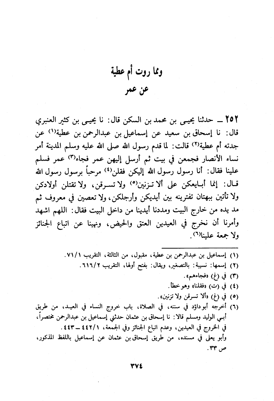 252 - حَدَثَنَا يَحْيَى بْنُ مُحَمَّدِ بْنِ السَّكَنِ قَالَ: نا يَحْيَى بْنُ كَثِيرٍ الْعَنْبَرِيُّ قَالَ: نا إِسْحَاقُ بْنُ سَعِيدٍ، عَنْ إِسْمَاعِيلَ بْنِ عَبْدِ الرَّحْمَنِ بْنِ عَطِيَّةَ، عَنْ جَدَّتِهِ أُمِّ عَطِيَّةَ قَالَتْ: لَمَّا قَدِمَ رَسُولُ اللَّهِ صَلَّى اللهُ عَلَيْهِ وَسَلَّمَ الْمَدِينَةَ أَمَرَ نِسَاءَ الْأَنْصَارِ فَجُمِعْنَ فِي بَيْتٍ، ثُمَّ أَرْسَلَ إِلَيْهِنَّ عُمَرَ، فَجَاءَ عُمَرُ فَسَلَّمَ عَلَيْنَا فَقَالَ: أَنَا رَسُولُ رَسُولِ اللَّهِ إِلَيْكُنَّ، فَقُلْنَ: مَرْحَبًا بِرَسُولِ رَسُولِ اللَّهِ قَالَ: " §إِنَّمَا أُبَايِعُكُنَّ عَلَى أَلَّا تَزْنِينَ، وَلَا تَسْرِقْنَ، وَلَا تَقْتُلْنَ أَوْلَادَكُنَّ، وَلَا تَأْتِينَ بِبُهْتَانٍ تَفْتَرِينَهُ بَيْنَ أَيْدِيكُنَّ وَأَرْجُلِكُنَّ، وَلَا تَعْصِينَ فِي مَعْرُوفٍ، ثُمَّ مَدَّ يَدَهُ مِنْ خَارِجِ الْبَيْتِ وَمَدَدْنَا أَيْدِينَا مِنْ دَاخِلِ الْبَيْتِ، فَقَالَ: اللَّهُمَّ اشْهَدْ، وَأَمَرَنَا أَنْ نُخْرِجَ فِي الْعِيدَيْنِ الْعُتَّقَ وَالْحُيَّضَ، وَنُهِينَا عَنِ اتِّبَاعِ الْجَنَائِزِ وَلَا جُمُعَةَ عَلَيْنَا "