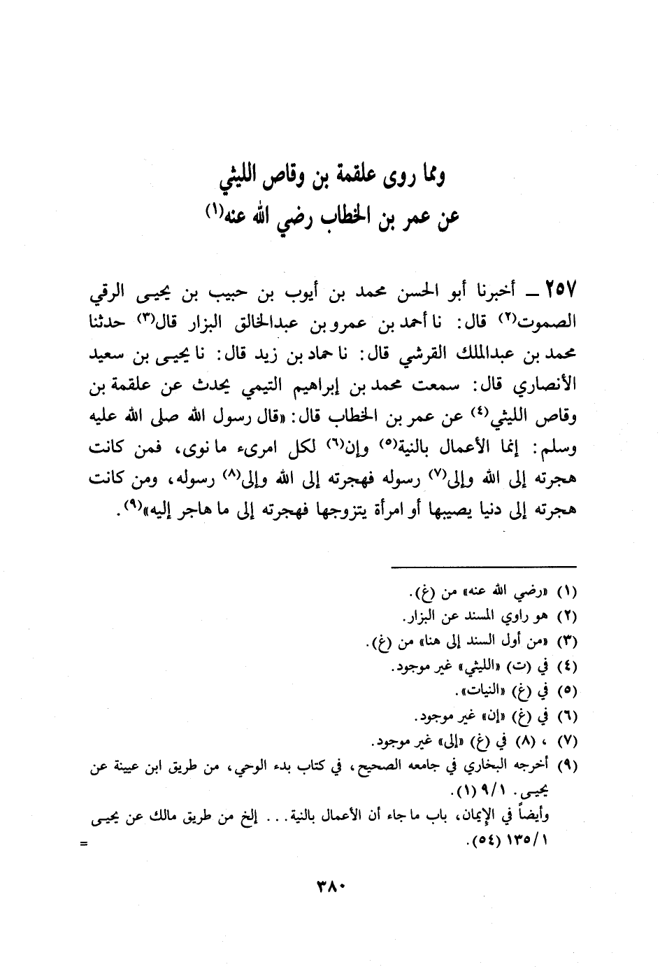 257 - أَخْبَرَنَا أَبُو الْحَسَنِ مُحَمَّدُ بْنُ أَيُّوبَ بْنِ حَبِيبِ بْنِ يَحْيَى الرَّقِّيُّ الصَّمُوتُ قَالَ: نا أَحْمَدُ بْنُ عَمْرِو بْنِ عَبْدِ الْخَالِقِ الْبَزَّارُ قَالَ: حَدَّثَنَا مُحَمَّدُ بْنُ عَبْدِ الْمَلِكِ الْقُرَشِيُّ قَالَ: نا حَمَّادُ بْنُ زَيْدٍ قَالَ: نا يَحْيَى بْنُ سَعِيدٍ الْأَنْصَارِيُّ قَالَ: سَمِعْتُ مُحَمَّدَ بْنَ إِبْرَاهِيمَ التَّيْمِيَّ، يُحَدِّثُ عَنْ عَلْقَمَةَ بْنِ وَقَّاصٍ اللَّيْثِيِّ، عَنْ عُمَرَ بْنِ الْخَطَّابِ، قَالَ: قَالَ رَسُولُ اللَّهِ صَلَّى اللهُ عَلَيْهِ وَسَلَّمَ: «§إِنَّمَا الْأَعْمَالُ بِالنِّيَّةِ، وَإِنَّ لِكُلِّ امْرِئٍ مَا نَوَى، فَمَنْ كَانَتْ هِجْرَتُهُ إِلَى اللَّهِ وَإِلَى رَسُولِهِ فَهِجْرَتُهُ إِلَى اللَّهِ وَإِلَى رَسُولِهِ، وَمَنْ كَانَتْ هِجْرَتُهُ إِلَى دُنْيَا يُصِيبُهَا أَوِ امْرَأَةٍ يَتَزَوَّجُهَا فَهِجْرَتُهُ إِلَى مَا هَاجَرَ إِلَيْهِ» -[381]- قَالَ أَبُو بَكْرٍ: وَهَذَا الْحَدِيثُ قَدْ رَوَاهُ عَنْ يَحْيَى بْنِ سَعِيدٍ جَمَاعَةٌ كَثِيرَةٌ -[382]- مِنْهُمْ عَمْرُو بْنُ الْحَارِثِ وَمَالِكُ بْنُ أَنَسٍ وَسُفْيَانُ الثَّوْرِيُّ، وَعَبْدُ الْوَهَّابِ فِي جَمَاعَةٍ كَثِيرَةٍ، وَلَا نَعْلَمُ يُرْوَى هَذَا الْكَلَامُ إِلَّا عَنْ عُمَرَ بْنِ الْخَطَّابِ، عَنِ النَّبِيِّ صَلَّى اللهُ عَلَيْهِ وَسَلَّمَ بِهَذَا الْإِسْنَادِ، وَقَدْ رَوَى عَلْقَمَةُ بْنُ وَقَّاصٍ حَدِيثًا آخَرَ رَوَاهُ حَمَّادُ بْنُ سَلَمَةَ، عَنْ يَحْيَى بْنِ سَعِيدٍ، عَنْ مُحَمَّدِ بْنِ إِبْرَاهِيمَ، عَنْ عَلْقَمَةَ، عَنْ عُمَرَ، فَالثِّقَاتُ مِنْ أَصْحَابِ حَمَّادٍ لَا يَرْفَعُونَهُ، وَقَدْ رَفَعَهُ رَجُلٌ فَلَمْ نَذْكُرْهُ إِذْ كَانَ الثِّقَاتُ لَا يَرْفَعُونَهُ
