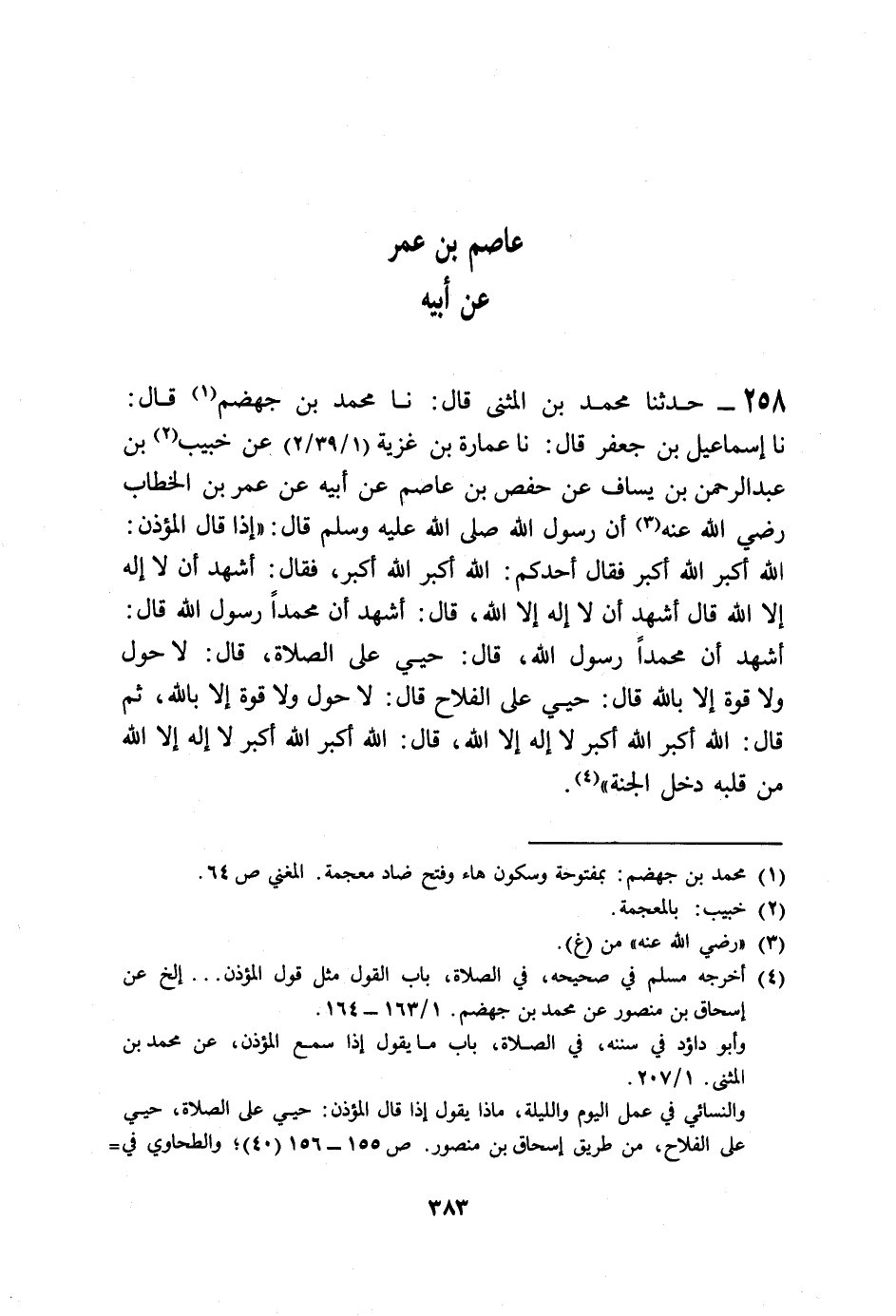 258 - حَدَّثَنَا مُحَمَّدُ بْنُ الْمُثَنَّى قَالَ: نا مُحَمَّدُ بْنُ جَهْضَمٍ قَالَ: نا إِسْمَاعِيلُ بْنُ جَعْفَرٍ قَالَ: نا عُمَارَةُ بْنُ غَزِيَّةَ، عَنْ خُبَيْبِ بْنِ عَبْدِ الرَّحْمَنِ بْنِ يَسَافٍ، عَنْ حَفْصِ بْنِ عَاصِمٍ، عَنْ أَبِيهِ، عَنْ عُمَرَ بْنِ الْخَطَّابِ، رَضِيَ اللَّهُ عَنْهُ: أَنَّ رَسُولَ اللَّهِ صَلَّى اللهُ عَلَيْهِ وَسَلَّمَ قَالَ: " §إِذَا قَالَ الْمُؤَذِّنُ: اللَّهُ أَكْبَرُ اللَّهُ أَكْبَرُ، فَقَالَ أَحَدُكُمُ: اللَّهُ أَكْبَرُ اللَّهُ أَكْبَرُ، فَقَالَ: أَشْهَدُ أَنْ لَا إِلَهَ إِلَّا اللَّهُ، قَالَ: أَشْهَدُ أَنْ لَا إِلَهَ إِلَّا اللَّهُ، قَالَ: أَشْهَدُ أَنَّ مُحَمَّدًا رَسُولُ اللَّهِ، قَالَ: أَشْهَدُ أَنَّ مُحَمَّدًا رَسُولُ اللَّهِ، قَالَ: حَيَّ عَلَى الصَّلَاةِ، قَالَ: لَا حَوْلَ وَلَا قُوَّةَ إِلَّا بِاللَّهِ، قَالَ: حَيَّ عَلَى الْفَلَاحِ، قَالَ: لَا حَوْلَ وَلَا قُوَّةَ إِلَّا بِاللَّهِ ثُمَّ قَالَ: اللَّهُ أَكْبَرُ اللَّهُ أَكْبَرُ لَا إِلَهَ إِلَّا اللَّهُ قَالَ: اللَّهُ أَكْبَرُ اللَّهُ أَكْبَرُ لَا إِلَهَ إِلَّا اللَّهُ، مِنْ قَلْبِهِ دَخَلَ الْجَنَّةَ " -[384]- وَهَذَا الْحَدِيثُ لَا نَعْلَمُهُ يُرْوَى عَنْ عُمَرَ إِلَّا مِنْ هَذَا الْوَجْهِ بِهَذَا الْإِسْنَادِ