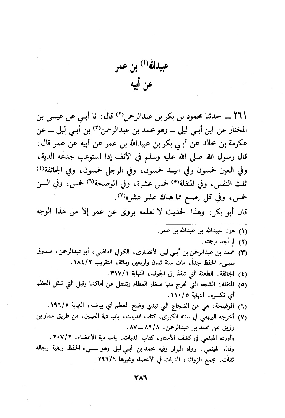 261 - حَدَّثَنَا مَحْمُودُ بْنُ بَكْرِ بْنِ عَبْدِ الرَّحْمَنِ، قَالَ: نا أَبِي، عَنْ عِيسَى بْنِ الْمُخْتَارِ، عَنِ ابْنِ أَبِي لَيْلَى وَهُوَ مُحَمَّدُ بْنُ عَبْدِ الرَّحْمَنِ بْنِ أَبِي لَيْلَى، عَنْ عِكْرِمَةَ بْنِ خَالِدٍ، عَنْ أَبِي بَكْرِ بْنِ عُبَيْدِ اللَّهِ بْنِ عُمَرَ، عَنْ أَبِيهِ، عَنْ عُمَرَ، قَالَ: قَالَ رَسُولُ اللَّهِ صَلَّى اللهُ عَلَيْهِ وَسَلَّمَ: «§فِي الْأَنْفِ إِذَا اسْتُوعِبَ جَدْعُهُ الدِّيَةُ، وَفِي الْعَيْنِ خَمْسُونَ، وَفِي الْيَدِ خَمْسُونَ، وَفِي الرِّجْلِ خَمْسُونَ، وَفِي الْجَائِفَةِ ثُلُثُ النَّفْسِ وَفِي الْمُنَقِّلَةِ خَمْسَ عَشْرَةَ، وَفِي الْمُوضِحَةِ خَمْسٌ، وَفِي السِّنِّ خَمْسٌ، وَفِي كُلِّ إِصْبُعٍ مِمَّا هُنَاكَ عَشْرٌ عَشْرٌ» قَالَ أَبُو بَكْرٍ وَهَذَا الْحَدِيثُ لَا نَعْلَمُهُ يُرْوَى عَنْ عُمَرَ إِلَّا مِنْ هَذَا الْوَجْهِ -[387]- بِهَذَا الْإِسْنَادِ، وَلَا نَعْلَمُ رَوَى عِكْرِمَةُ بْنُ خَالِدٍ، عَنْ أَبِي بَكْرِ بْنِ عُبَيْدِ اللَّهِ إِلَّا هَذَا الْحَدِيثَ