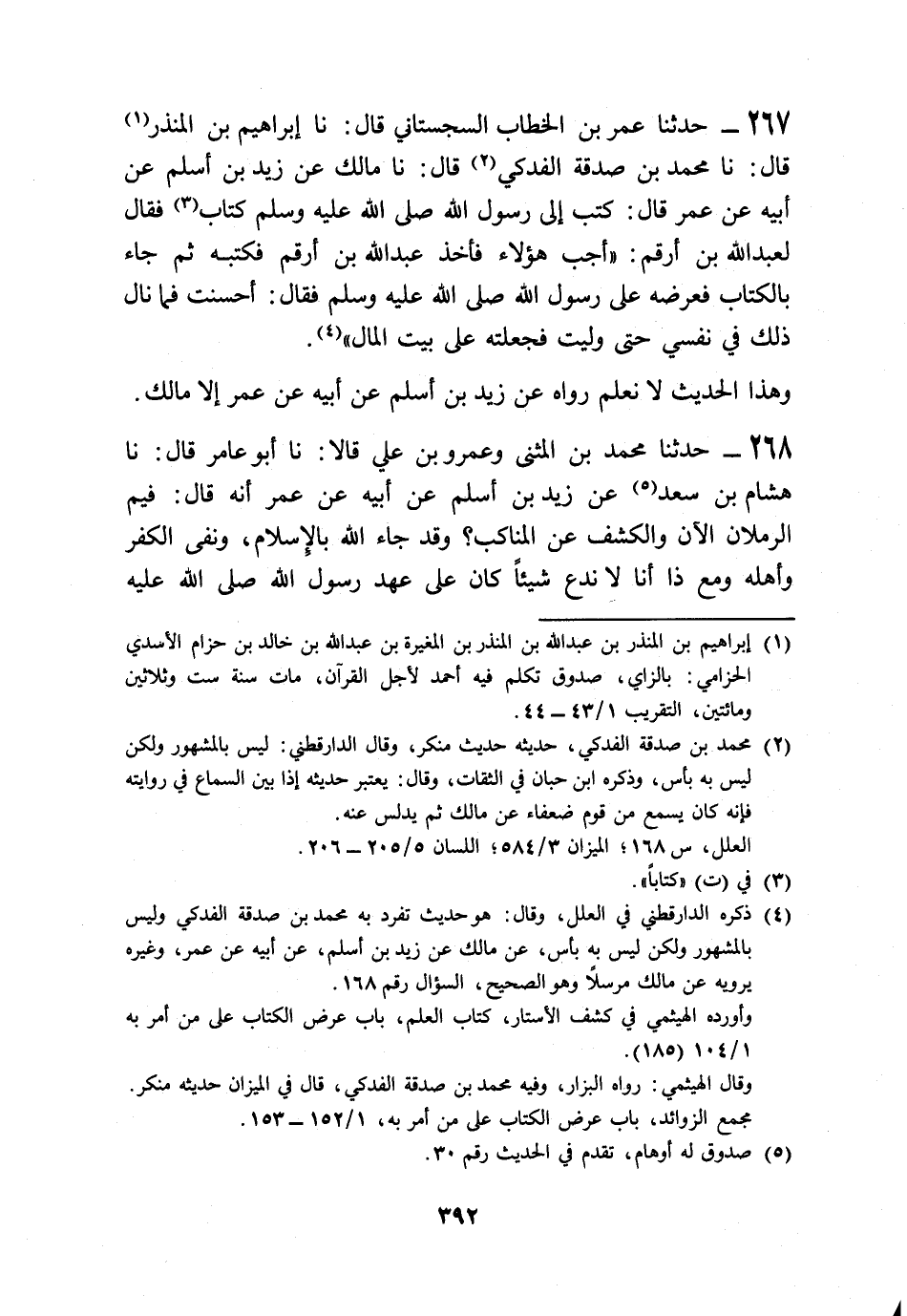 267 - حَدَّثَنَا عُمَرُ بْنُ الْخَطَّابِ السِّجِسْتَانِيُّ، قَالَ: نا إِبْرَاهِيمُ بْنُ الْمُنْذِرِ قَالَ: نا مُحَمَّدُ بْنُ صَدَقَةَ الْفَدَكِيُّ قَالَ: نا مَالِكٌ، عَنْ زَيْدِ بْنِ أَسْلَمَ، عَنْ أَبِيهِ، عَنْ عُمَرَ، قَالَ: §كُتِبَ إِلَى رَسُولِ اللَّهِ صَلَّى اللهُ عَلَيْهِ وَسَلَّمَ كِتَابٌ فَقَالَ لِعَبْدِ اللَّهِ بْنِ أَرْقَمَ: أَجِبْ هَؤُلَاءِ، فَأَخَذَ عَبْدُ اللَّهِ بْنُ أَرْقَمَ فَكَتَبَهُ، ثُمَّ جَاءَ بِالْكِتَابِ فَعَرَضَهُ عَلَى رَسُولِ اللَّهِ صَلَّى اللهُ عَلَيْهِ وَسَلَّمَ فَقَالَ: «أَحْسَنْتَ» فَمَا زَالَ ذَلِكَ فِي نَفْسِي حَتَّى وُلِّيتُ فَجَعَلْتُهُ عَلَى بَيْتِ الْمَالِ وَهَذَا الْحَدِيثُ لَا نَعْلَمُ رَوَاهُ عَنْ زَيْدِ بْنِ أَسْلَمَ، عَنْ أَبِيهِ، عَنْ عُمَرَ، إِلَّا مَالِكٌ